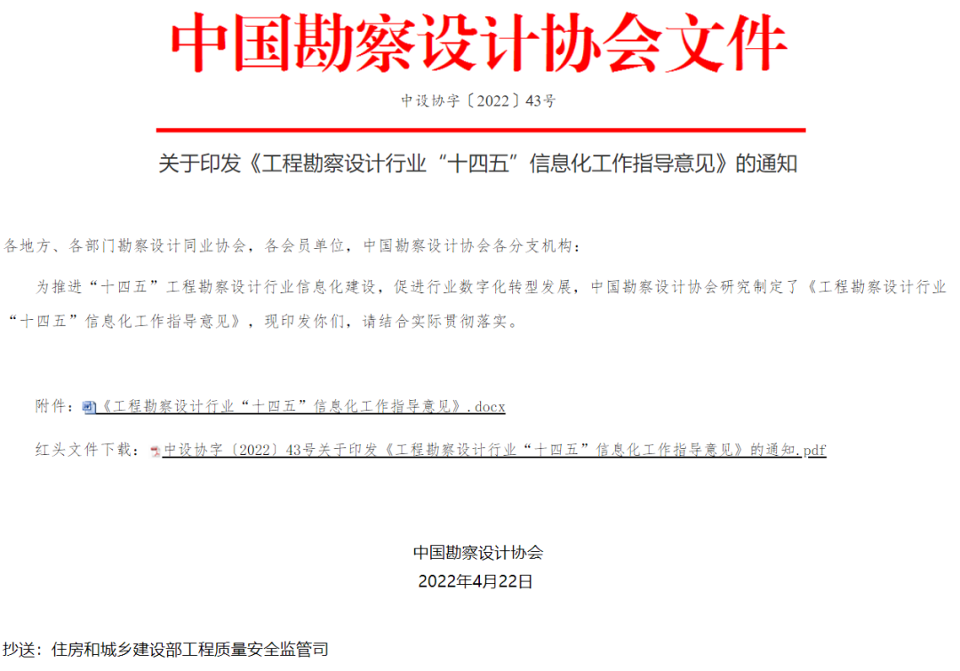 近日,为推进“十四五”工程勘察设计行业信息化建设,促进行业数字化转型发展,中国勘察设计协会印发通知,正式发布《工程勘察设计行业“十四五”信息化工作指导意见》。