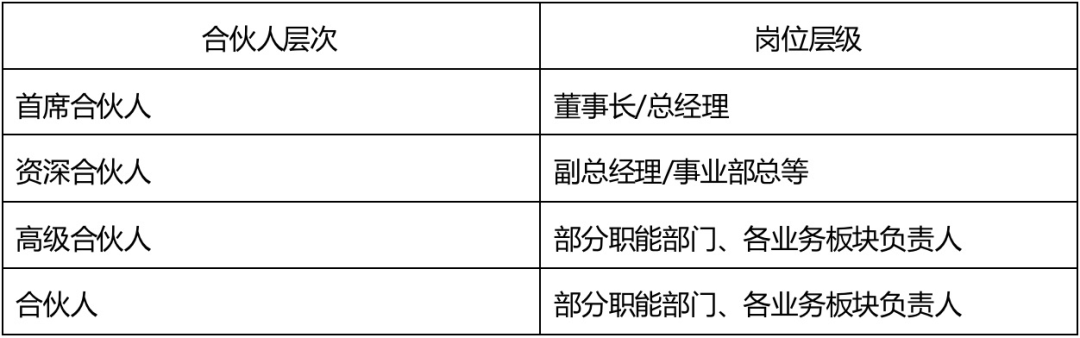 岗位层级与合伙人层次仅为对应关系示意,并非所在岗位人员均可成为合伙人,具体还是在实践中根据各维度进一步进行对位。