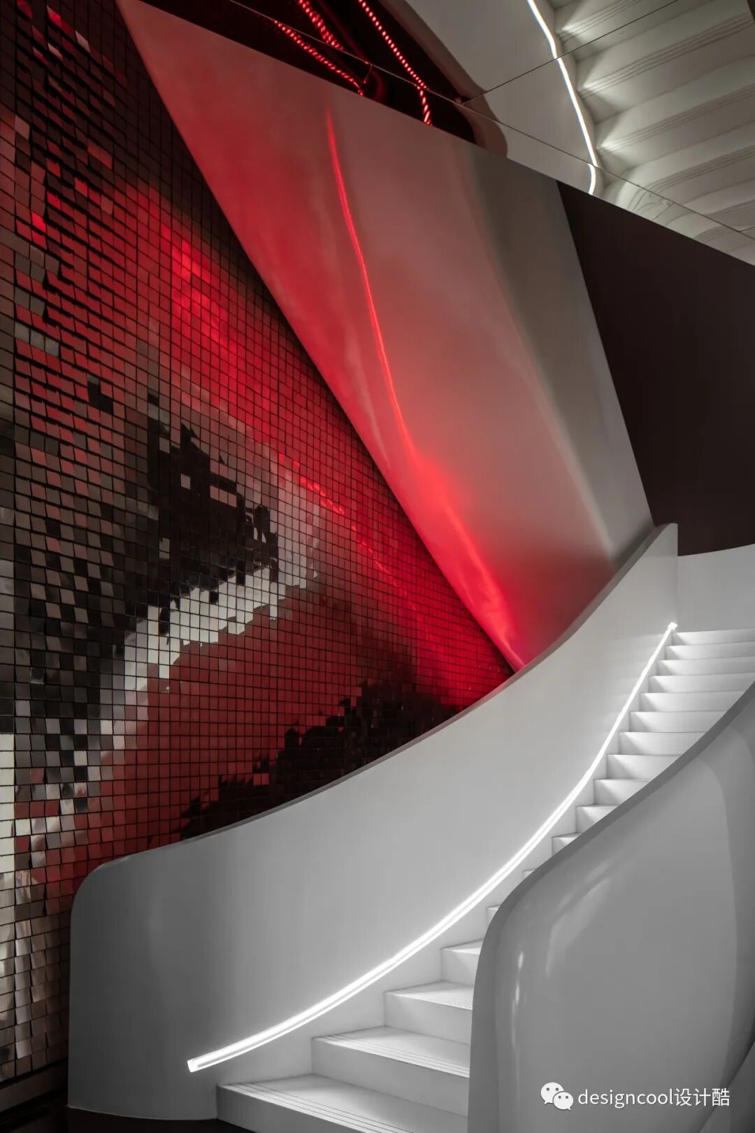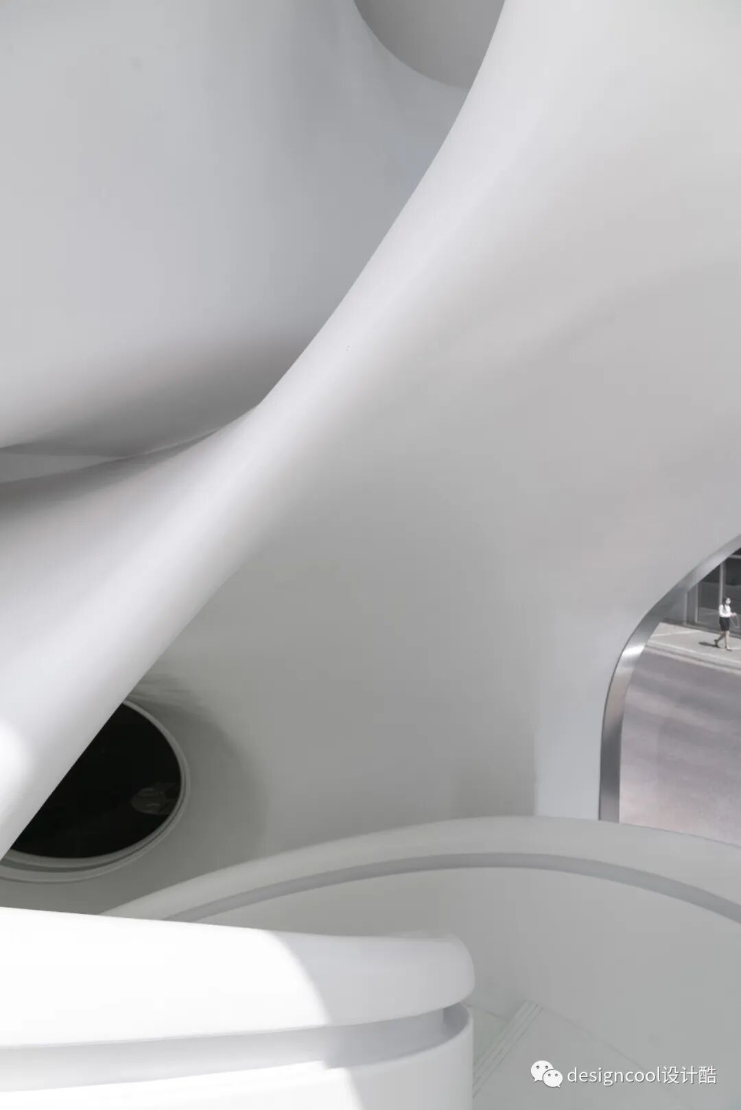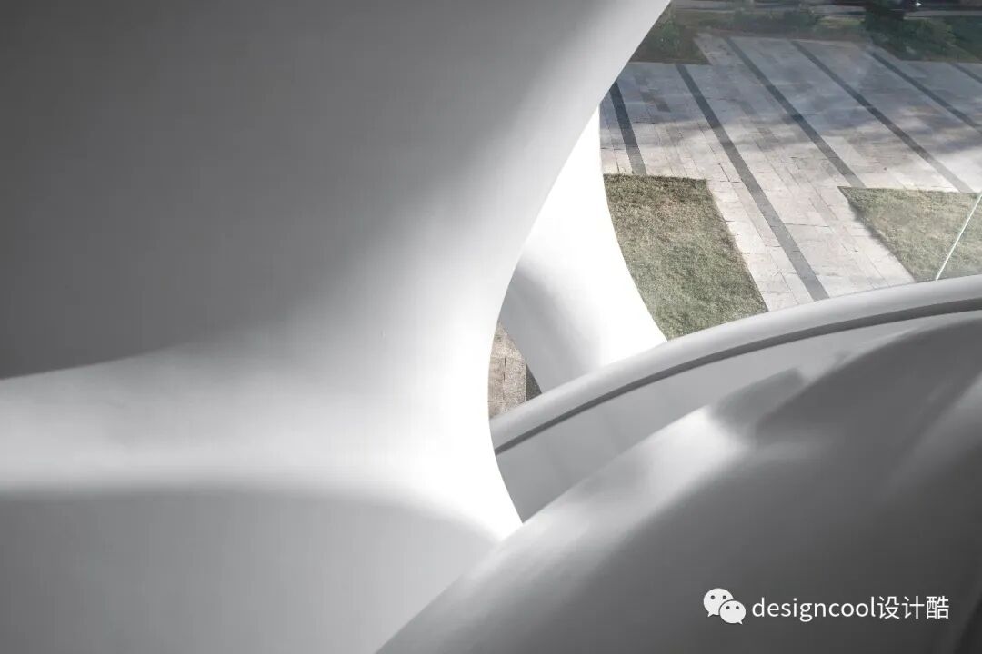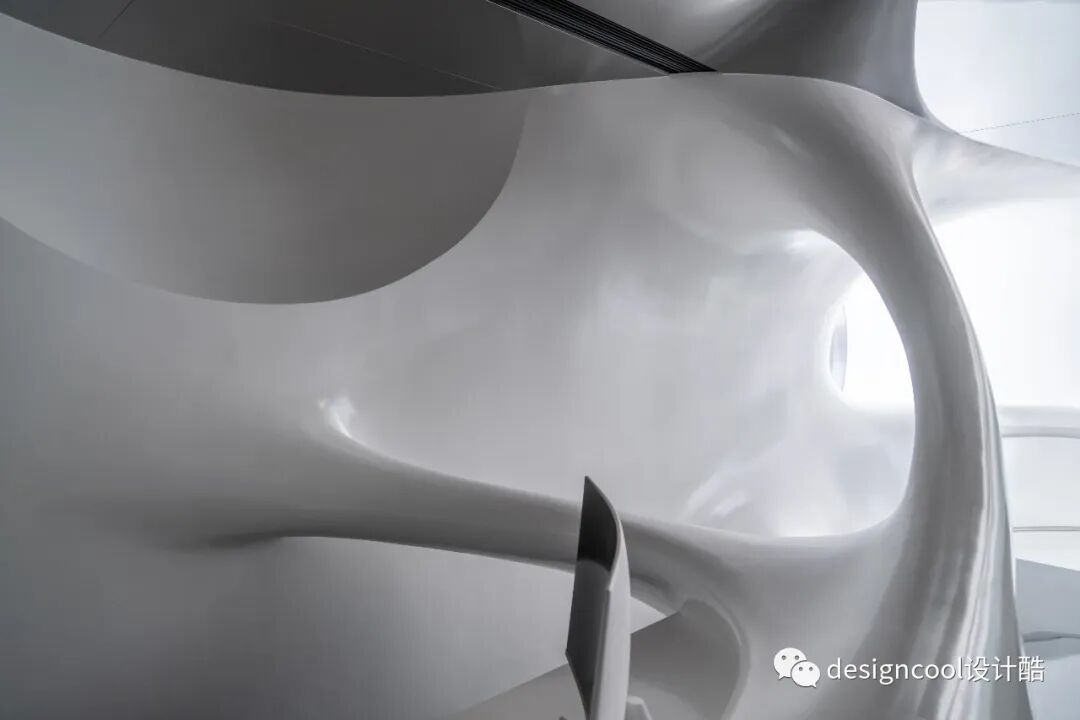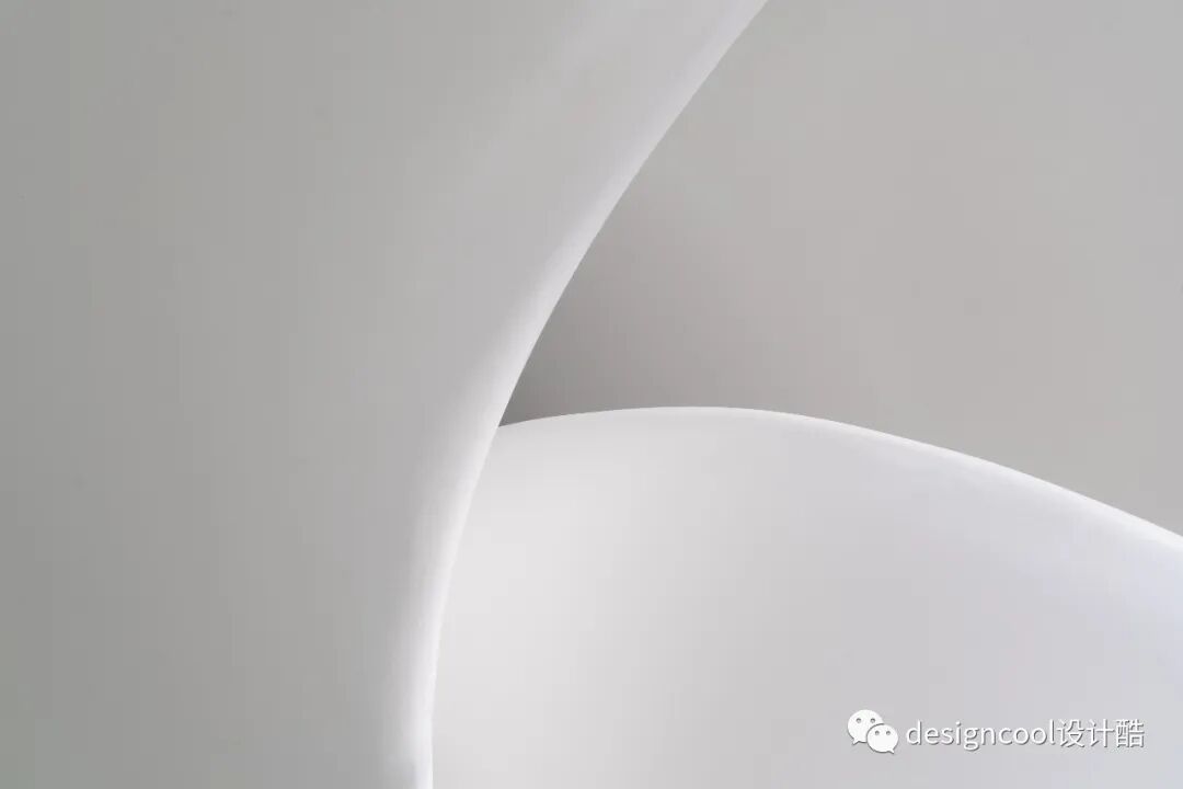 褶皱的异质在楼梯处最为强烈,在吧台处收尾。异质的空间将外观特征,前厅,交通,采光,咨询等多种诉求揉杂在一起,形成复杂的形式和体验。