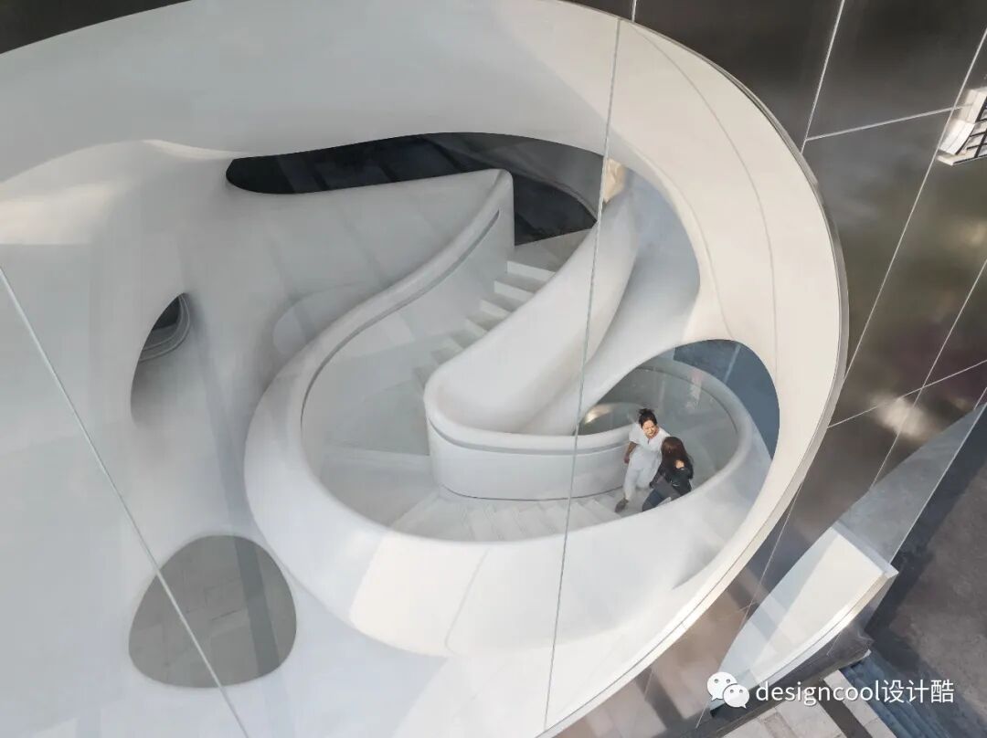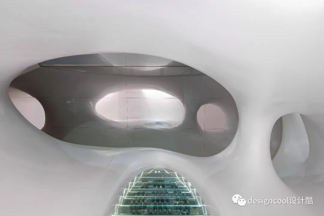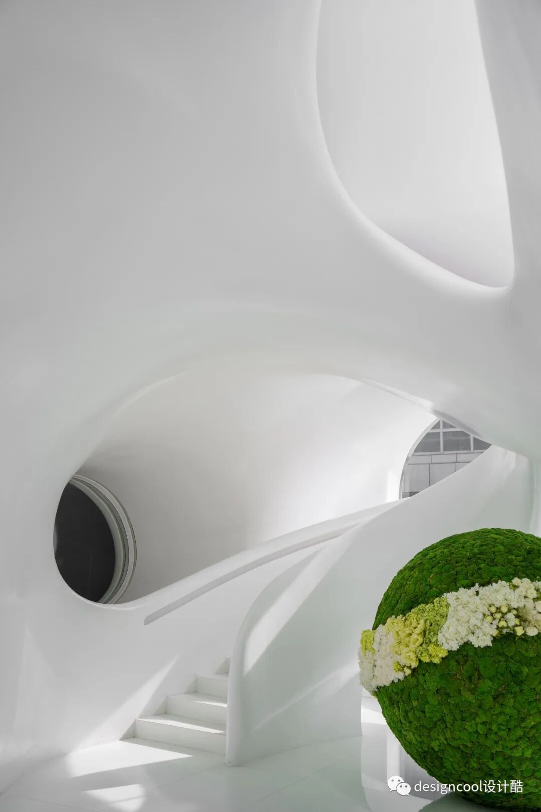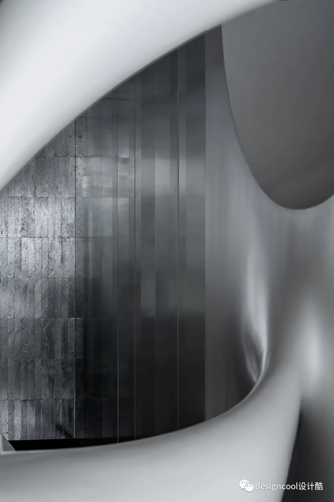 褶皱的异质在楼梯处最为强烈,在吧台处收尾。异质的空间将外观特征,前厅,交通,采光,咨询等多种诉求揉杂在一起,形成复杂的形式和体验。