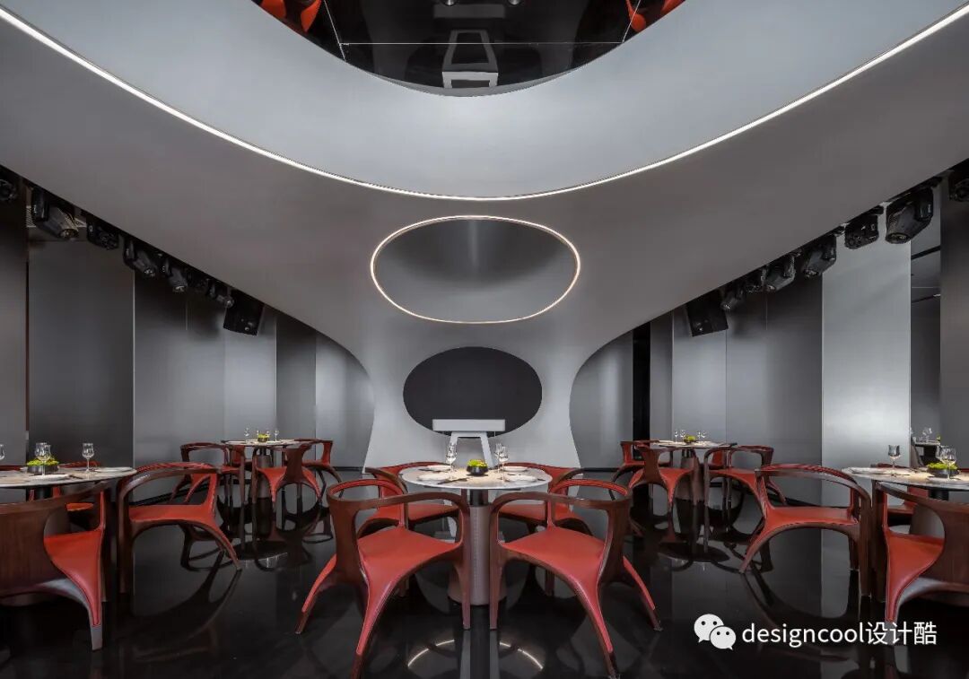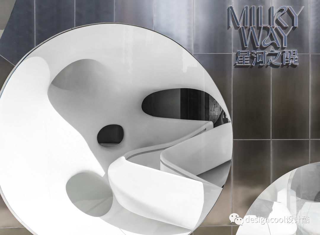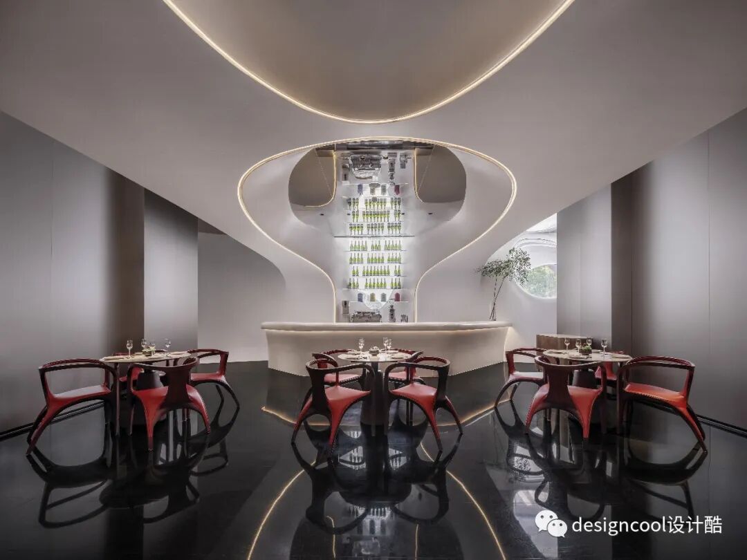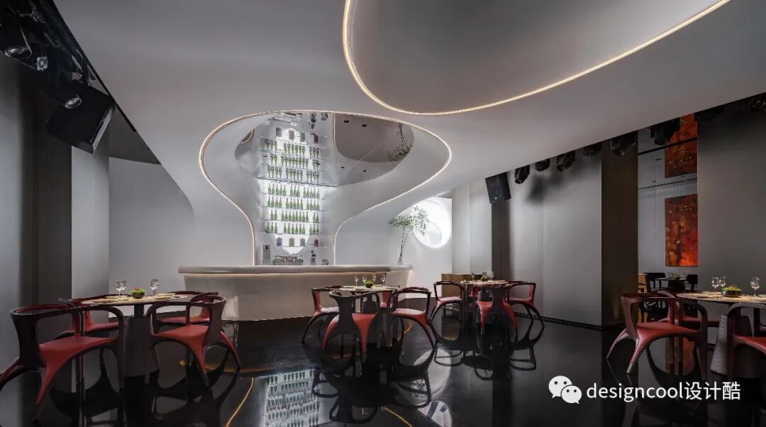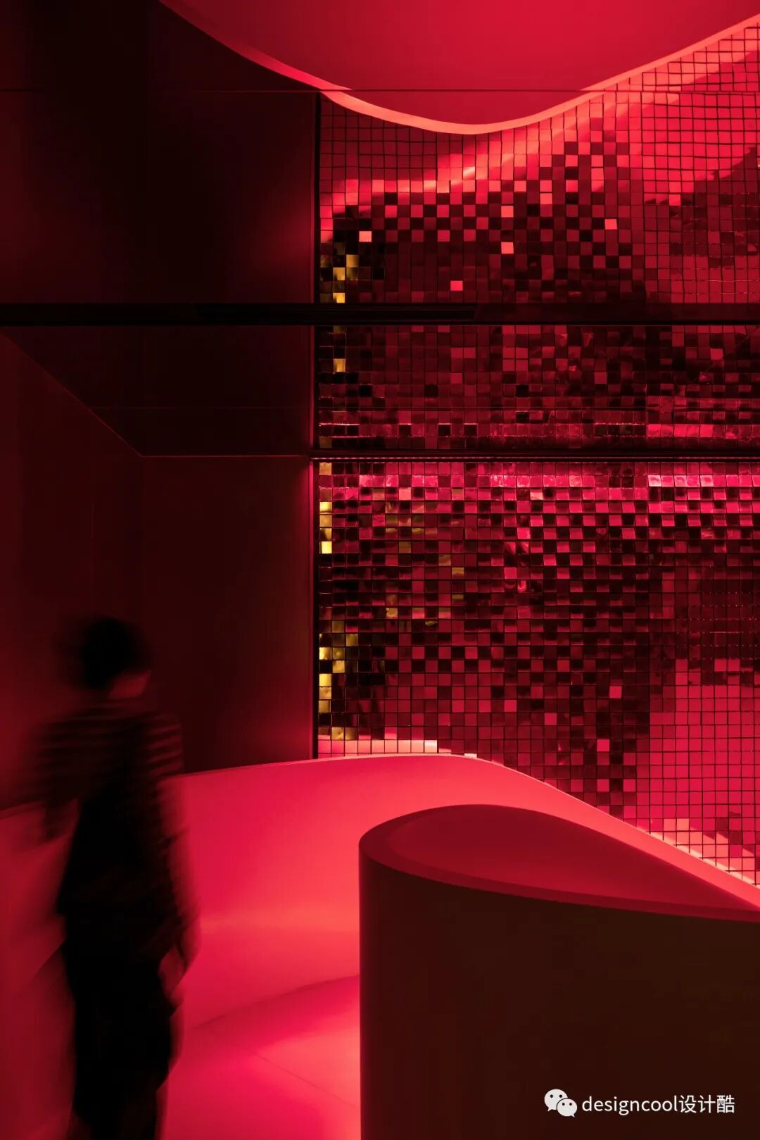 褶皱的异质置于内外之间,异质作为引子在外观特征在吧台之处结束,差异始终存在着。与引子的洁白,褶皱,轻盈不同,这里是厚重绚丽迷幻。