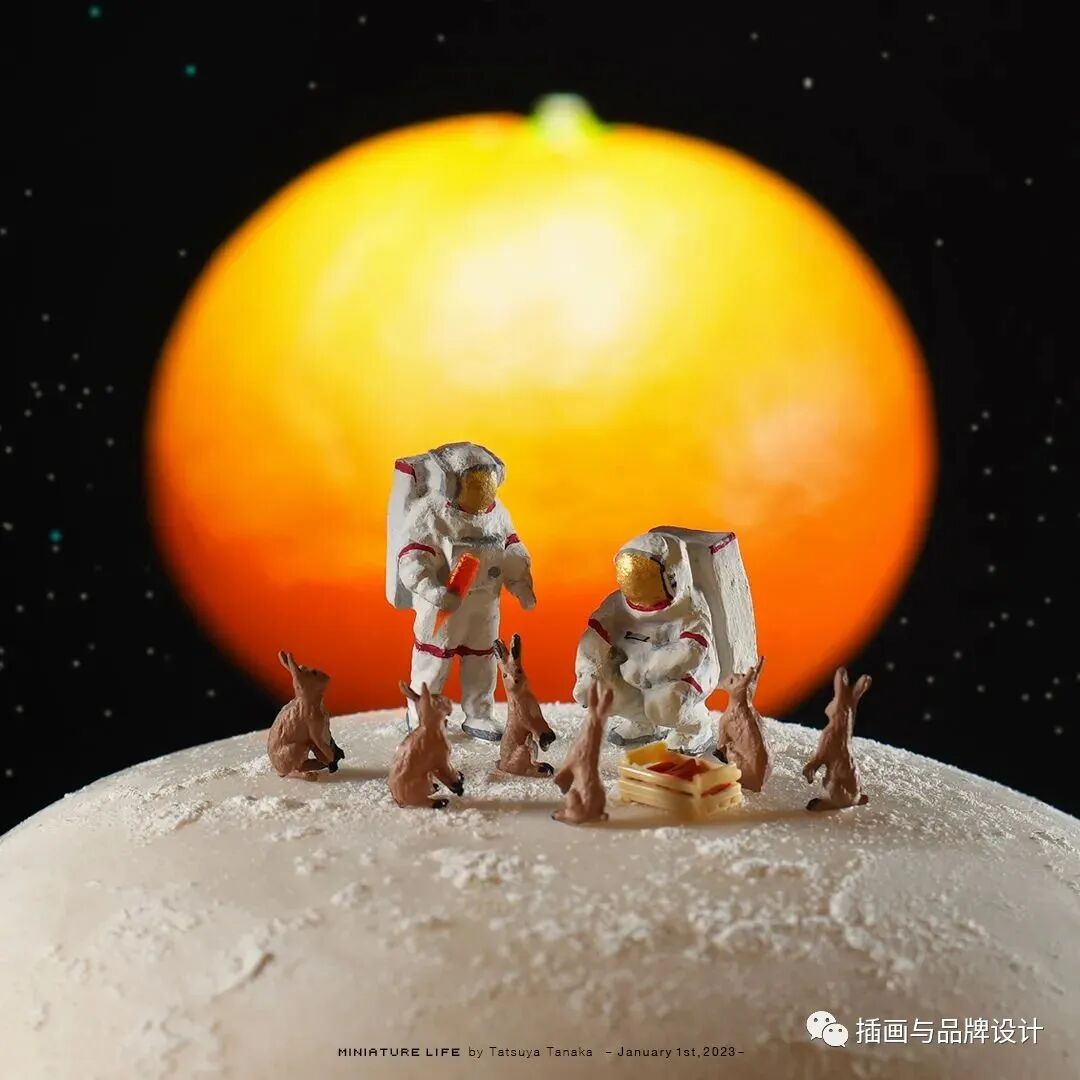 微观大师田中达也送来了食物和祝福,橘子是太阳,胡萝卜是宇宙飞船,馒头皮和面粉模拟月球表面,宇航员们成功着陆月球,给玉兔们送去了地球上的胡萝卜,同时两个馒头摞在一起也象征着新的一年要节节高的美好祝福。