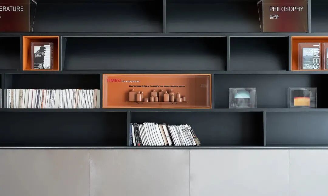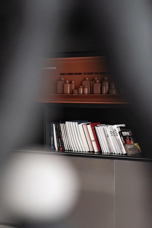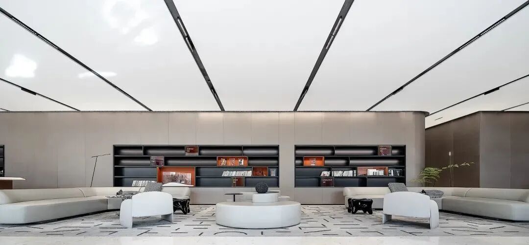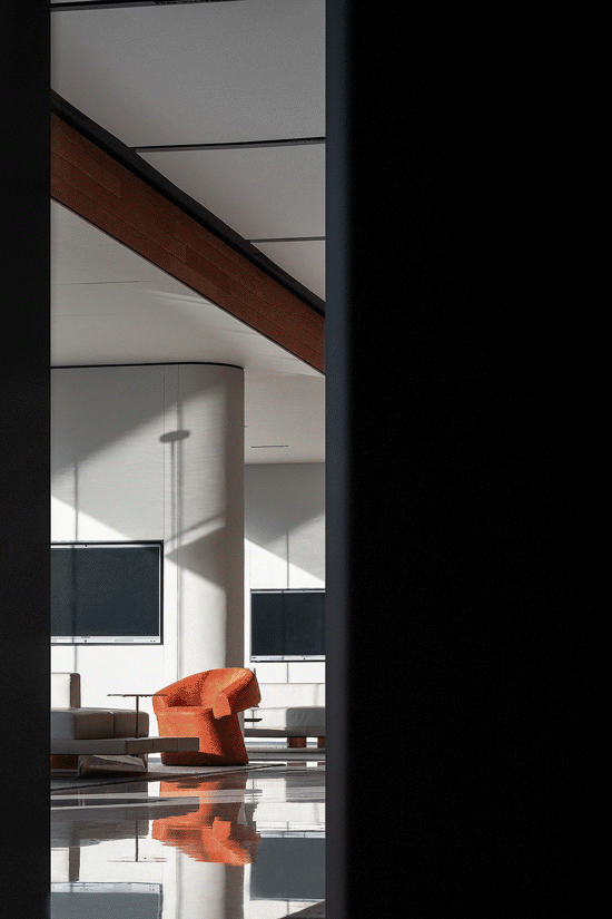 洽谈区域整个平面布局通透舒展,阳光透过玻璃在明暗之间和阅读区域共同演绎光明和阴翳的暧昧关系。