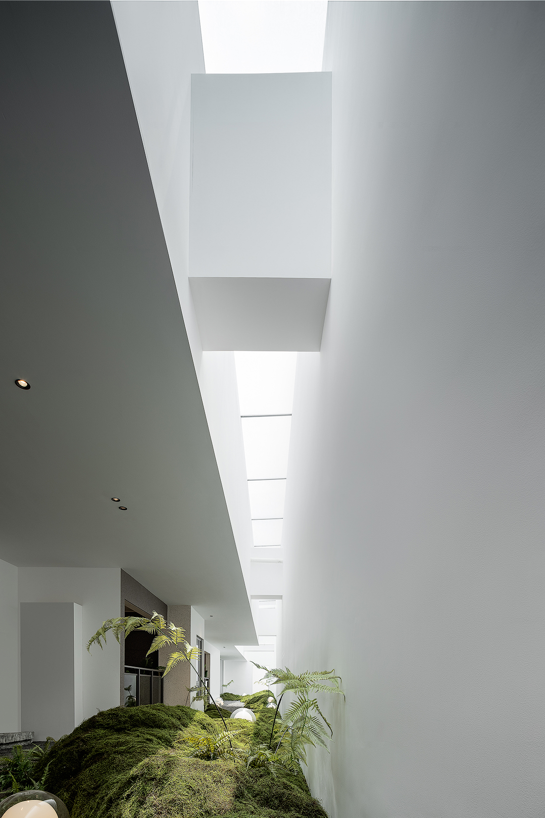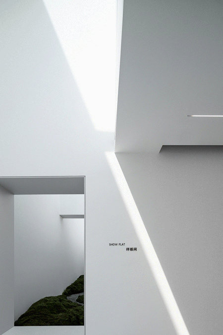 几套样板房共用的开敞景观面是一个微缩的园林小径,直面二层楼梯的开口将人们带入一个情境的起始——整个景观变成另一个“洞天”。