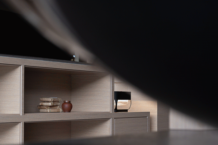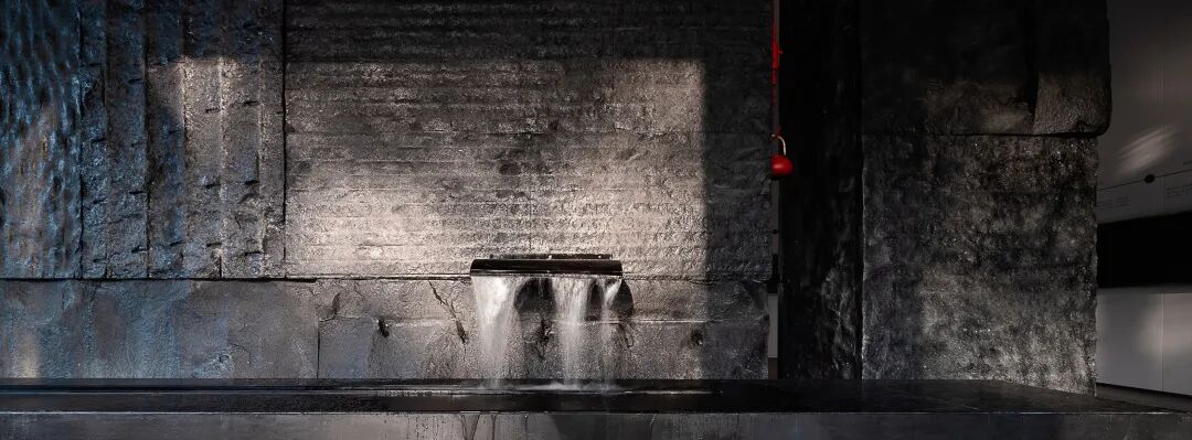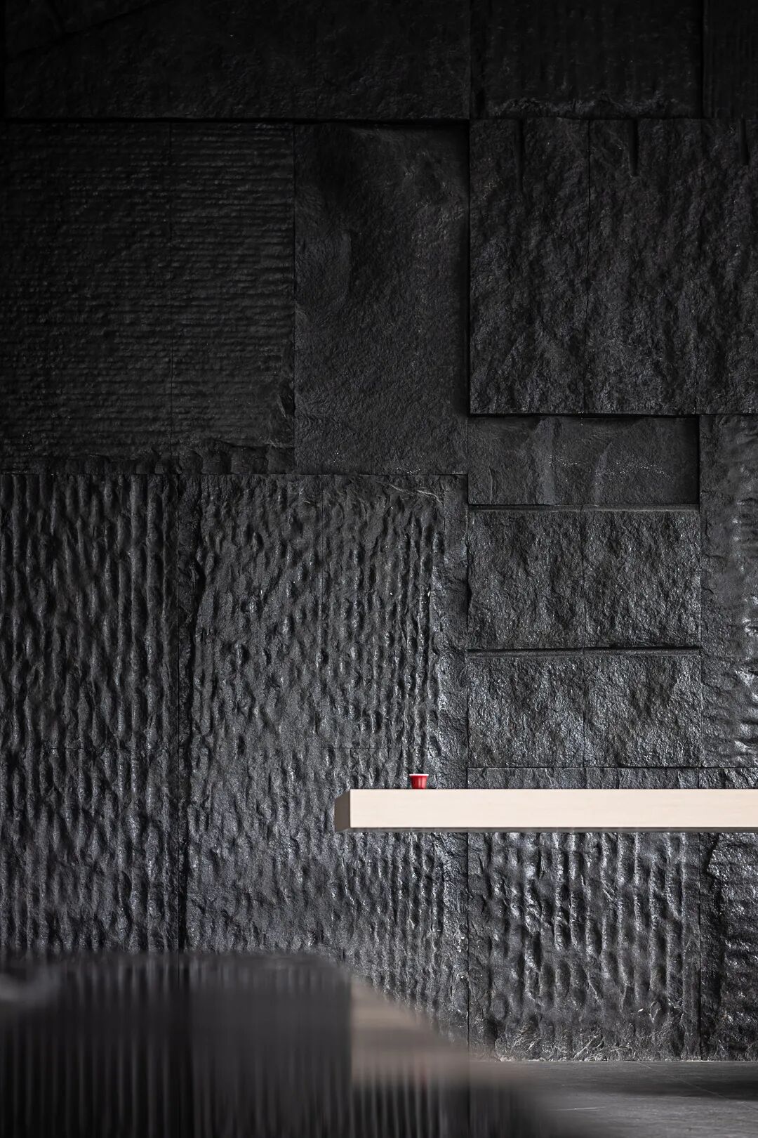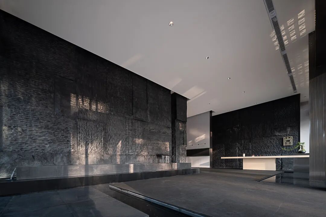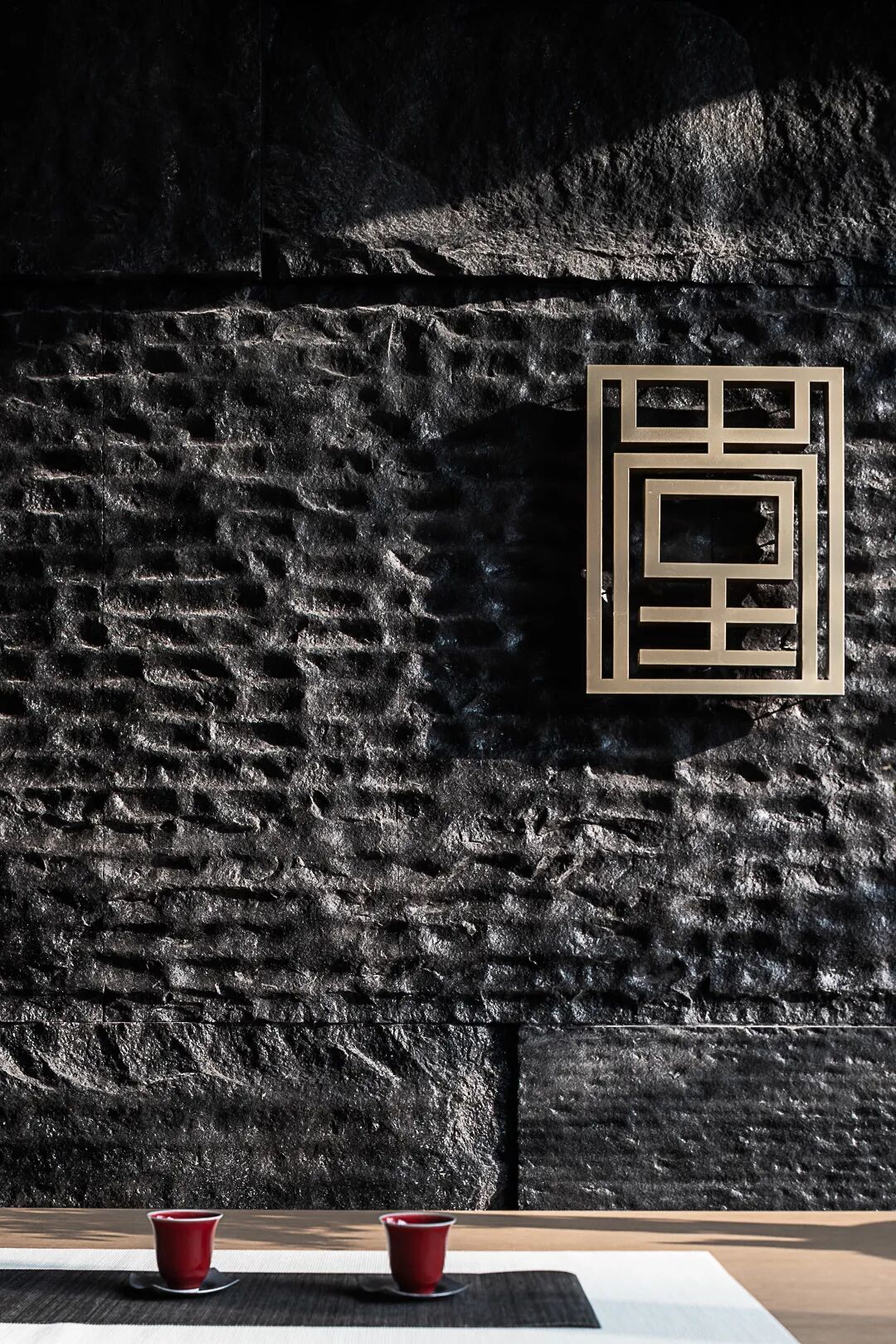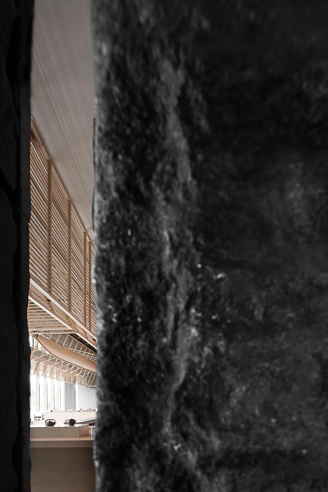 从门厅的岩间潺潺流水开始,体验的基调变得安静。循着弥散的茶香、琴音,岩壁上开凿的肌理交错并置,石的斑驳穿越时间裂隙,和鸣成曲。