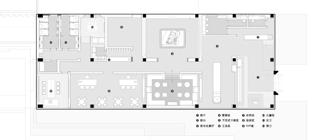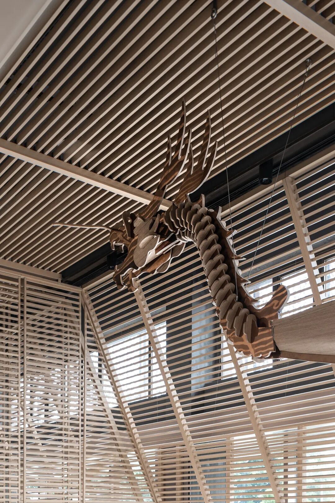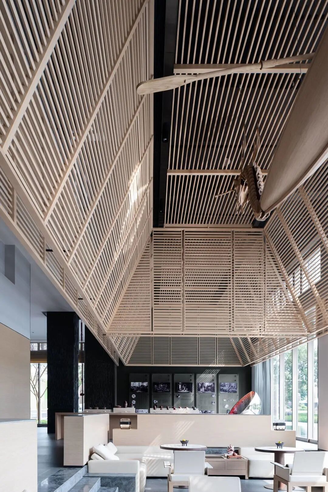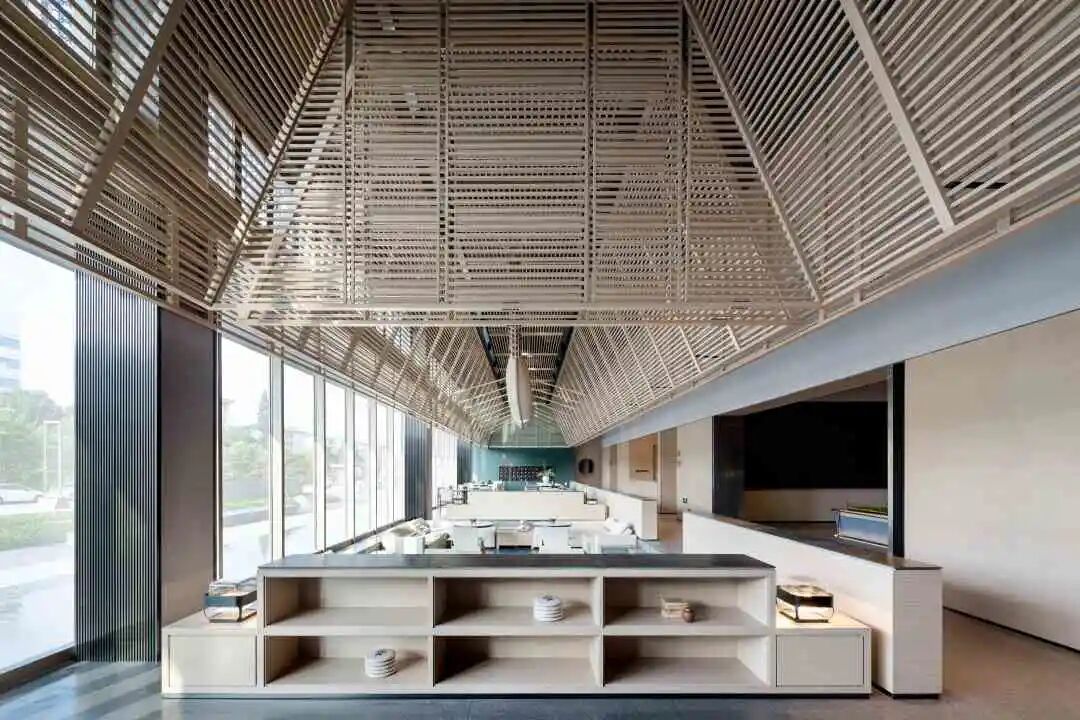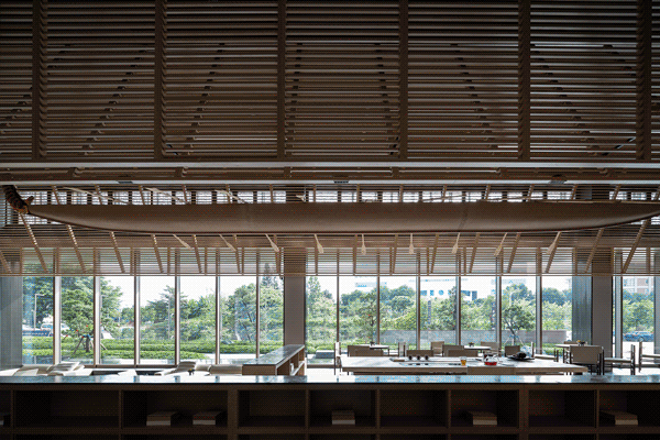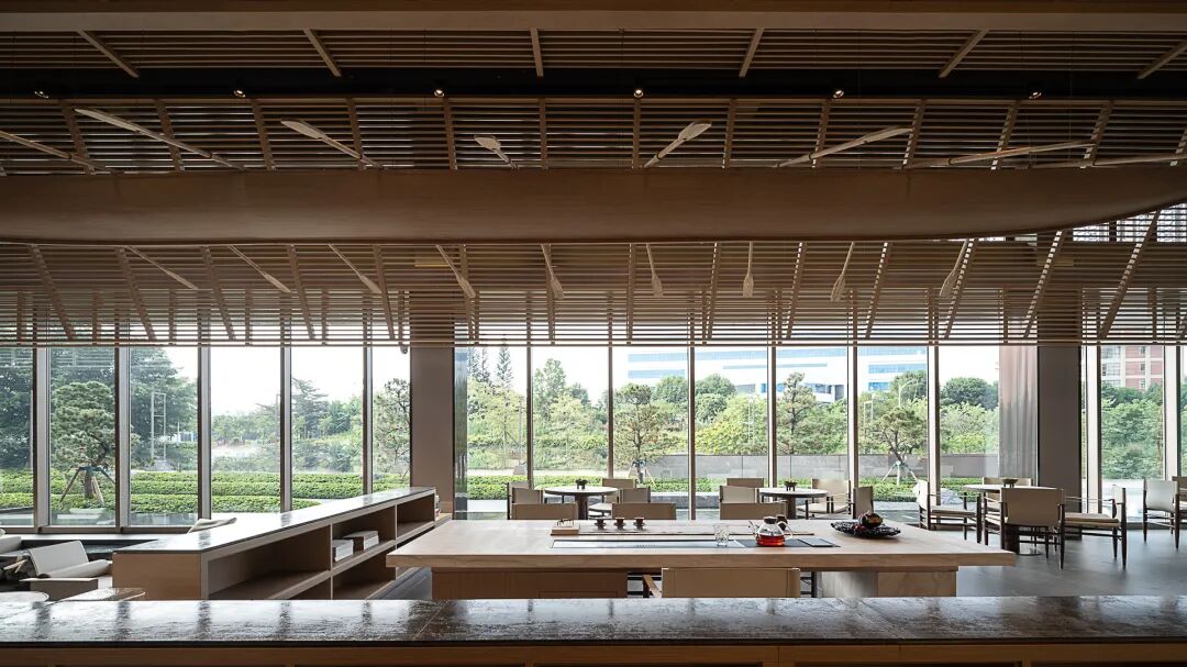 在下沉的洽谈区,视线自然降低,自顶面笼罩的木构宛若茶亭。