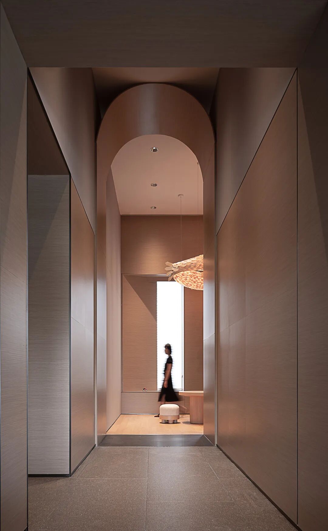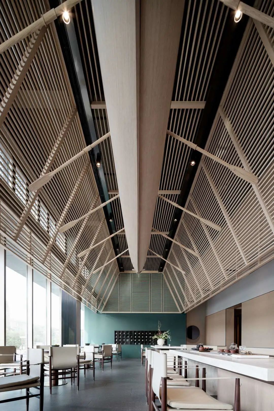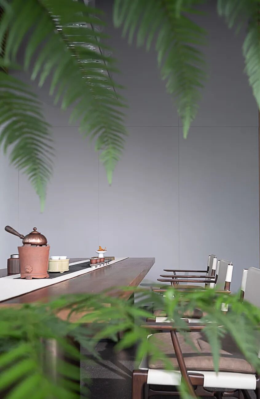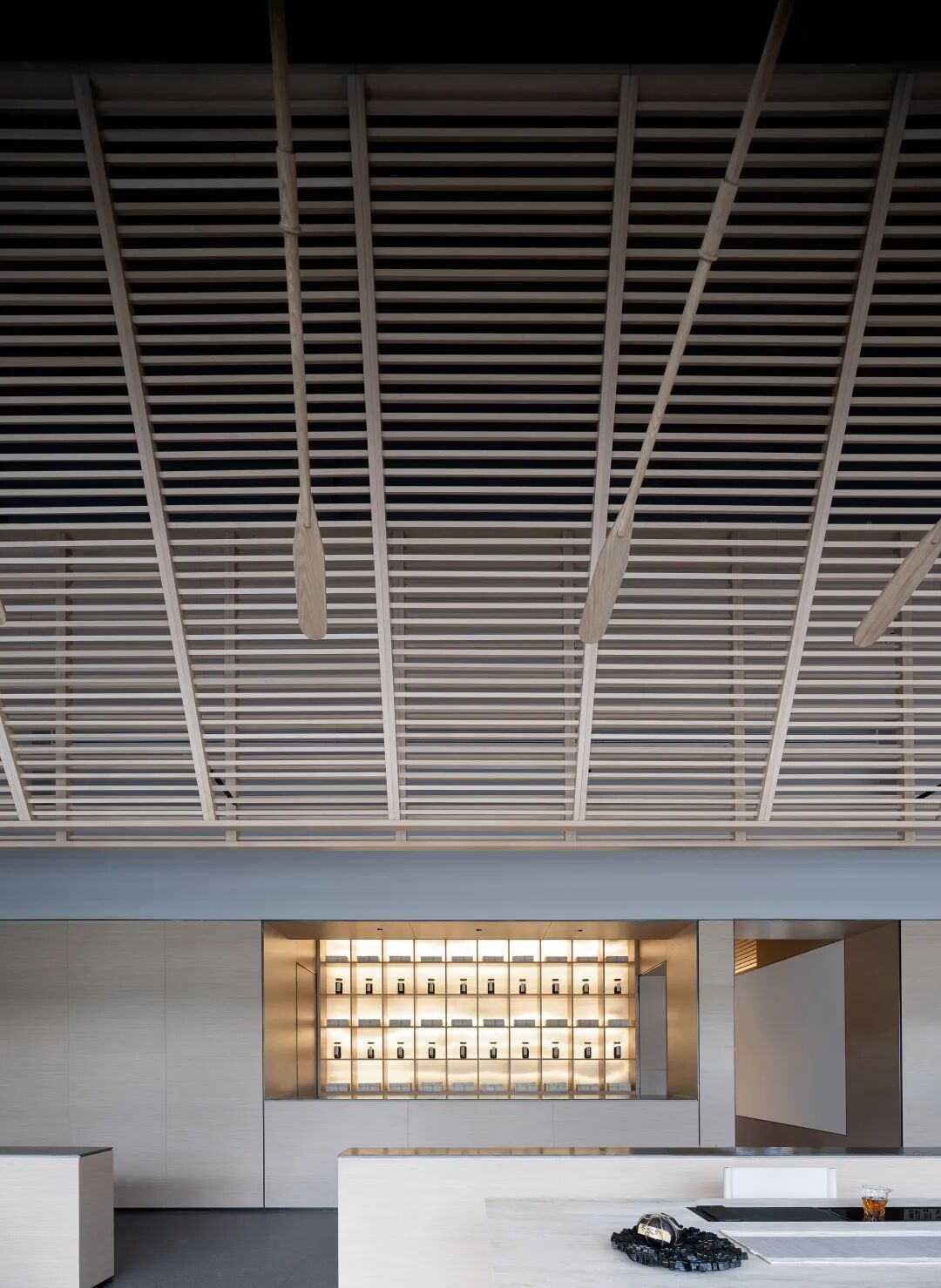随行进轴线展现的是隐逸都市的茶室场景,整个空间是徐徐展开的状态,与自然的关系进一步延伸至材料层面。