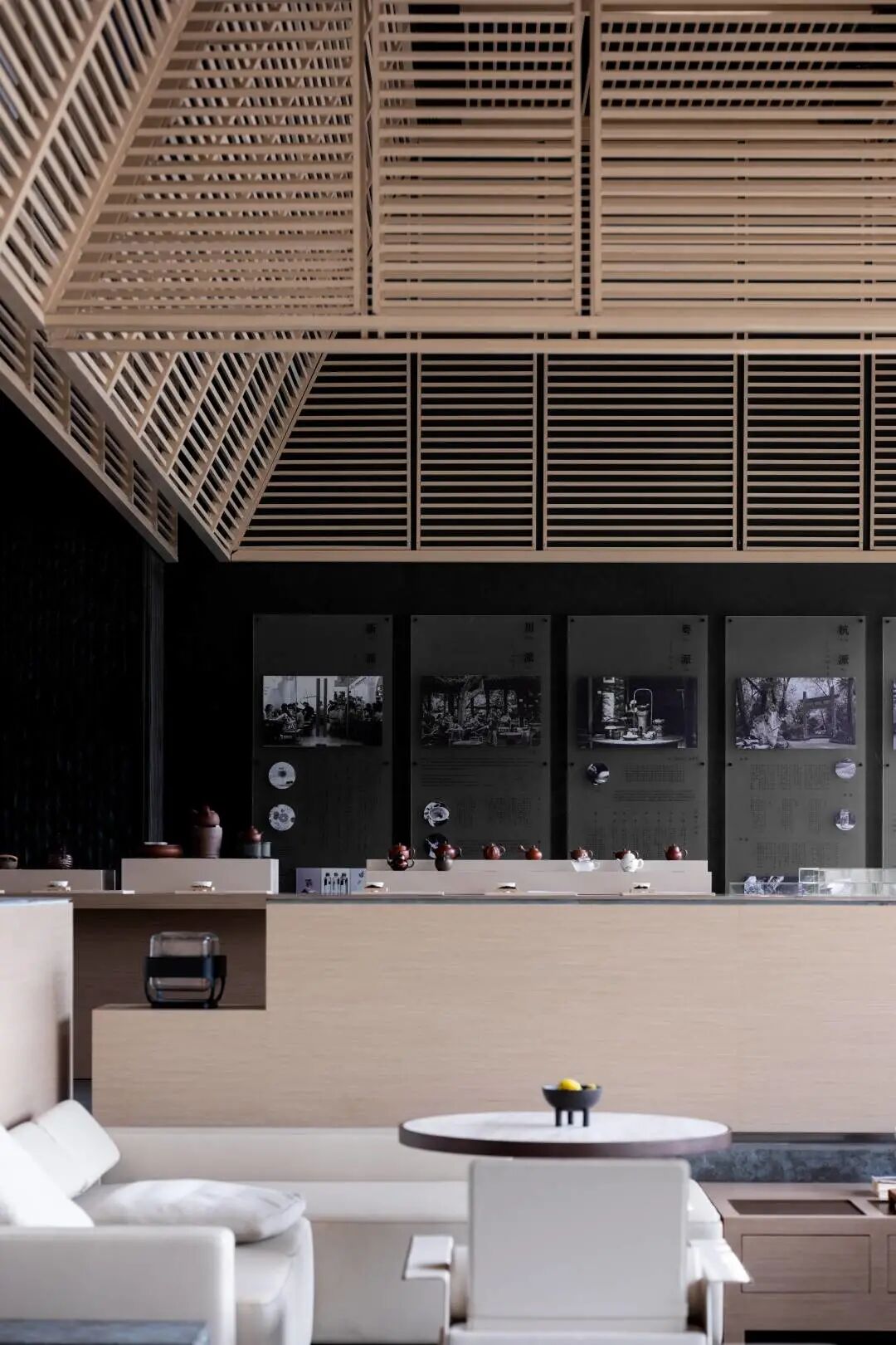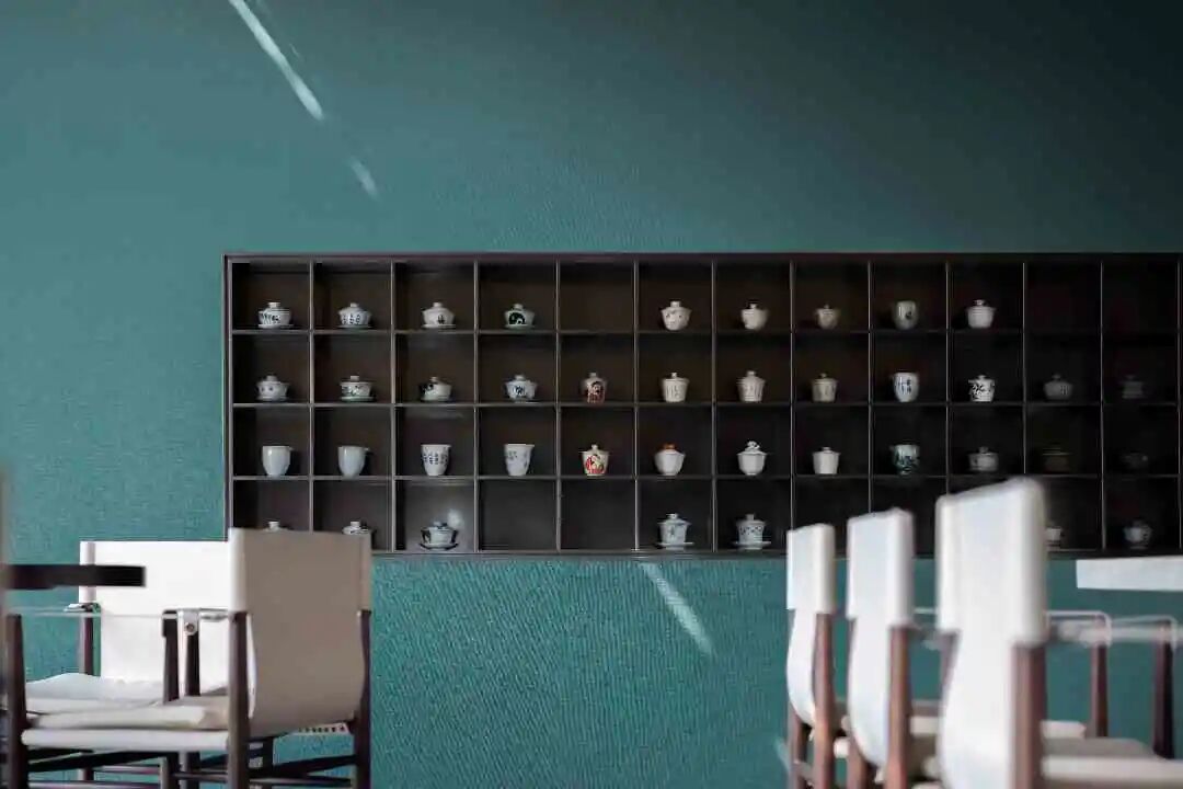 作为端景的各色茶具展示在洽谈区两侧,日用即道,形而上悟道。虽是先有茶再有茶器,但茶器却反过来升华了茶。