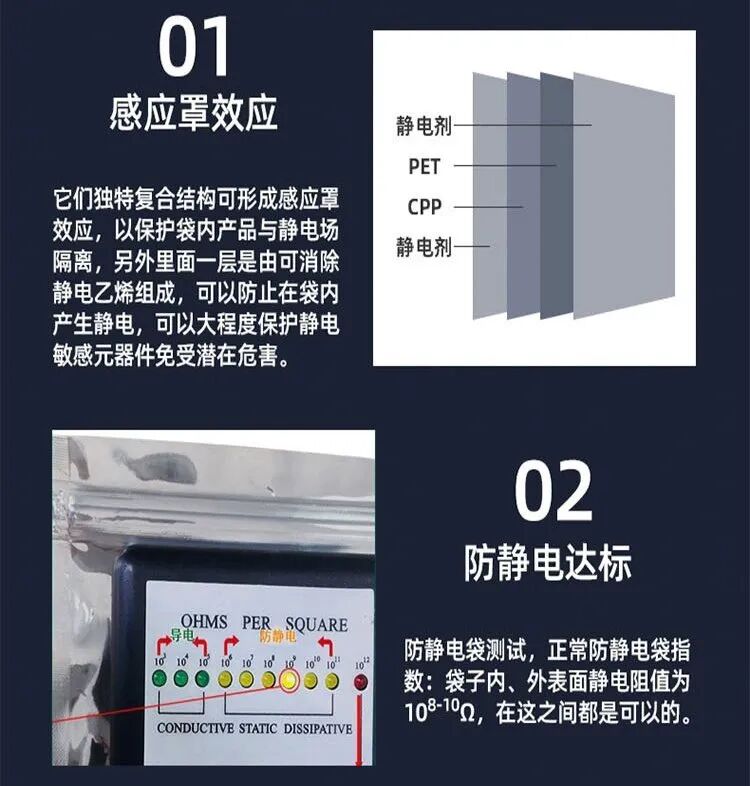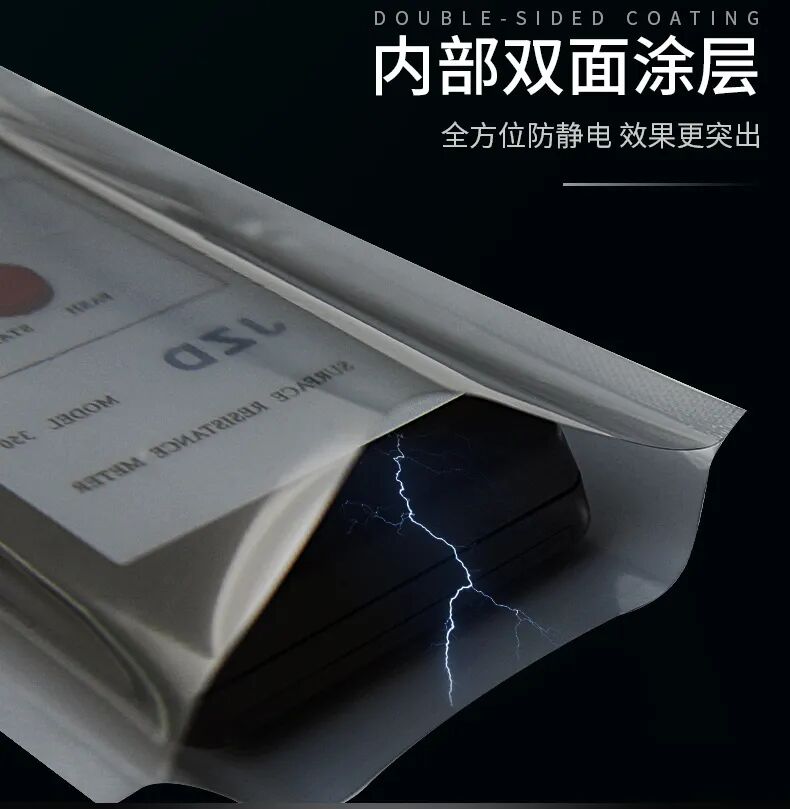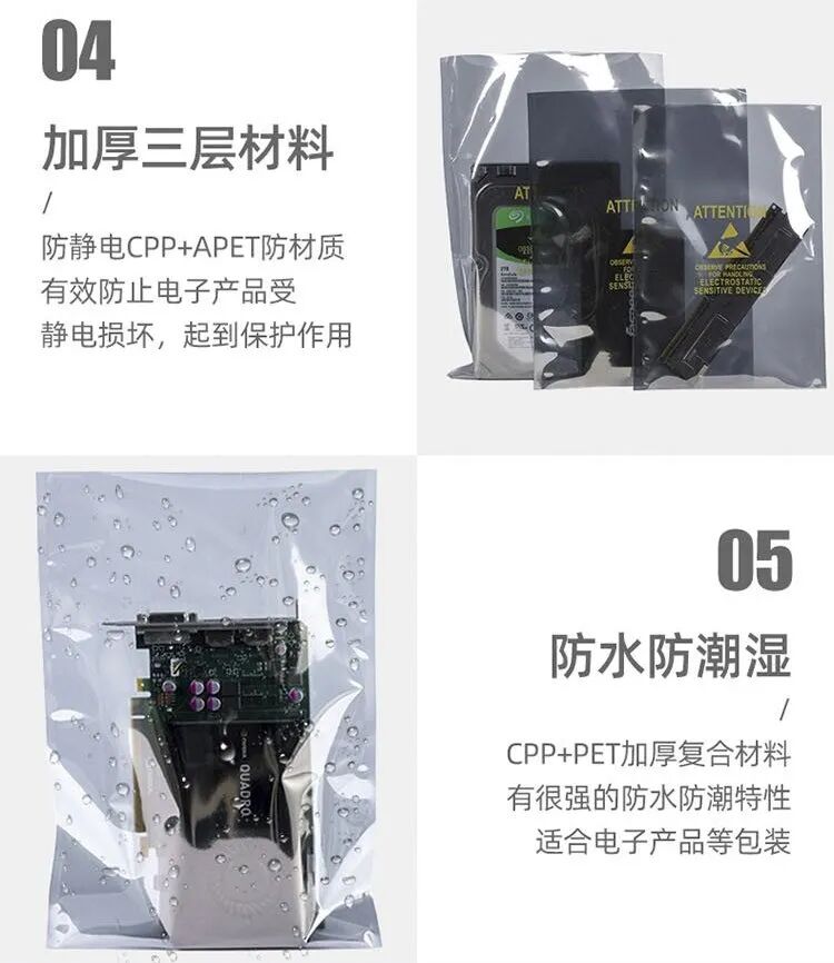 适用于PCB、IC等静电敏感类高科技电子产品的运输与包装。具有防静电、防潮功能。防静电防潮袋内外层由透明的防静电材料构成,中间层为阻隔性、导电性极佳的铝箔,因而具有良好的防静电、防潮、电磁屏蔽性能,外观银白色。主要应用于静电敏感,同时需要防潮、防电磁干扰的电子产品的包装。