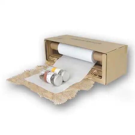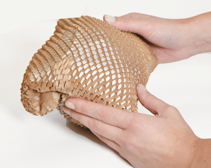 蜂巢纸包装是由外层环保模切牛皮纸和内衬纸组成,以独特的保护性蜂巢结构,广泛应用于化妆品、电商、药品、陶瓷、家居用品等领域。模切过的牛皮纸通过专门的设备(Geami HV)扩张成独特的3D蜂巢结构,具备良好的抗压、抗折特性,从而有效保护包裹产品不受挤压和损坏。