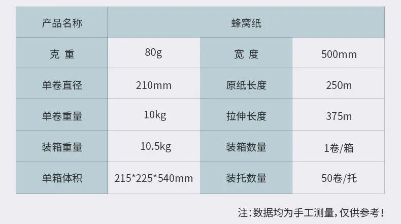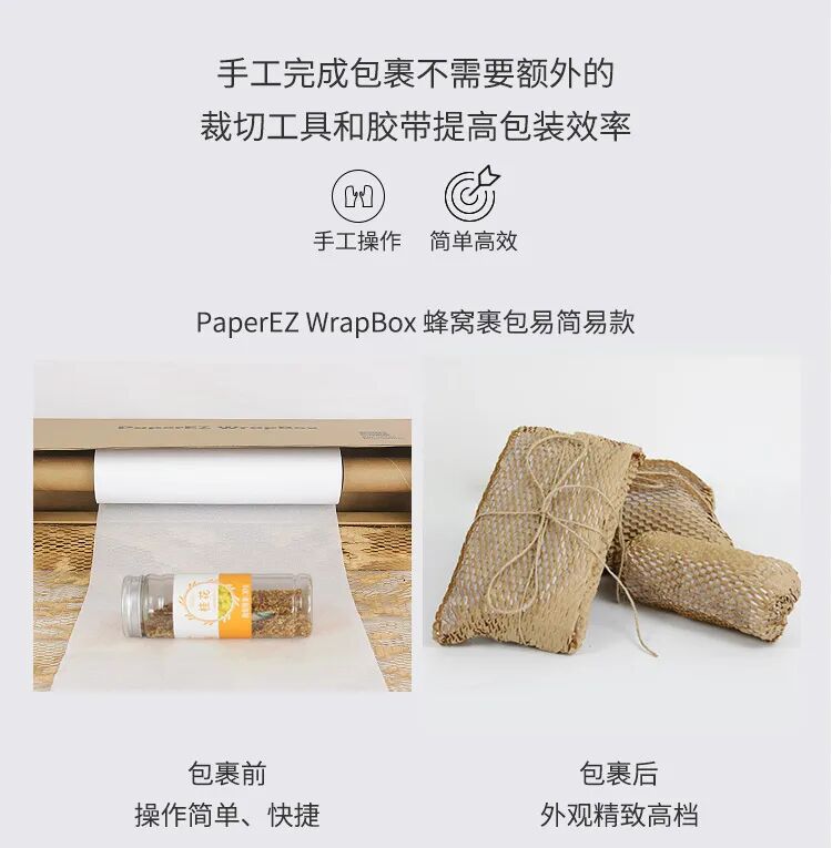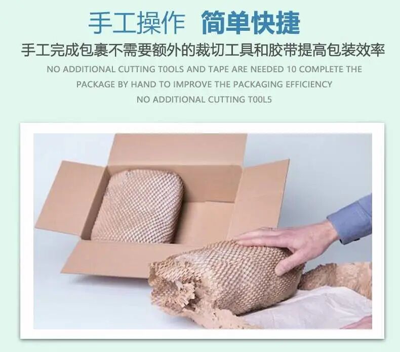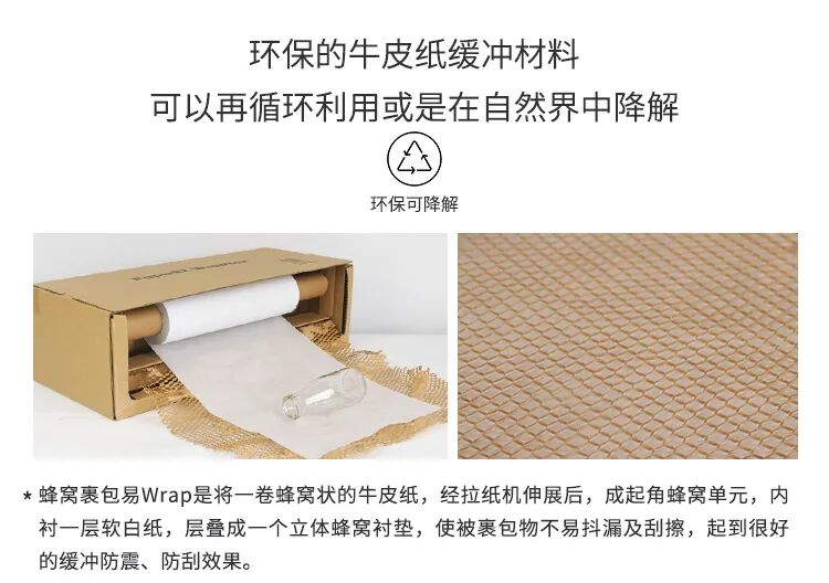 3、绿色环保:纸是可回收、可再生的资源,比气泡袋/柱等缓冲包材更加环保。这款蜂巢纸+麻绳的缓冲包装材料组合不仅易于使用与可回收利用,还可在自然界降解,真正实现绿色环保。传统的电商快递行业对塑料填充物十分依赖,急需一种可以替代原有气泡膜的产品来对应限塑要求。蜂巢纸作为缓冲材料,可以有效替代珍珠棉、泡泡纸、气泡柱等缓冲包装材料在物流输送中的作用。