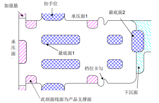 除放产品型腔和扣手,沉槽,下沉台阶等结构,大部分面都设计为承压面。承压面均高于产品表面。