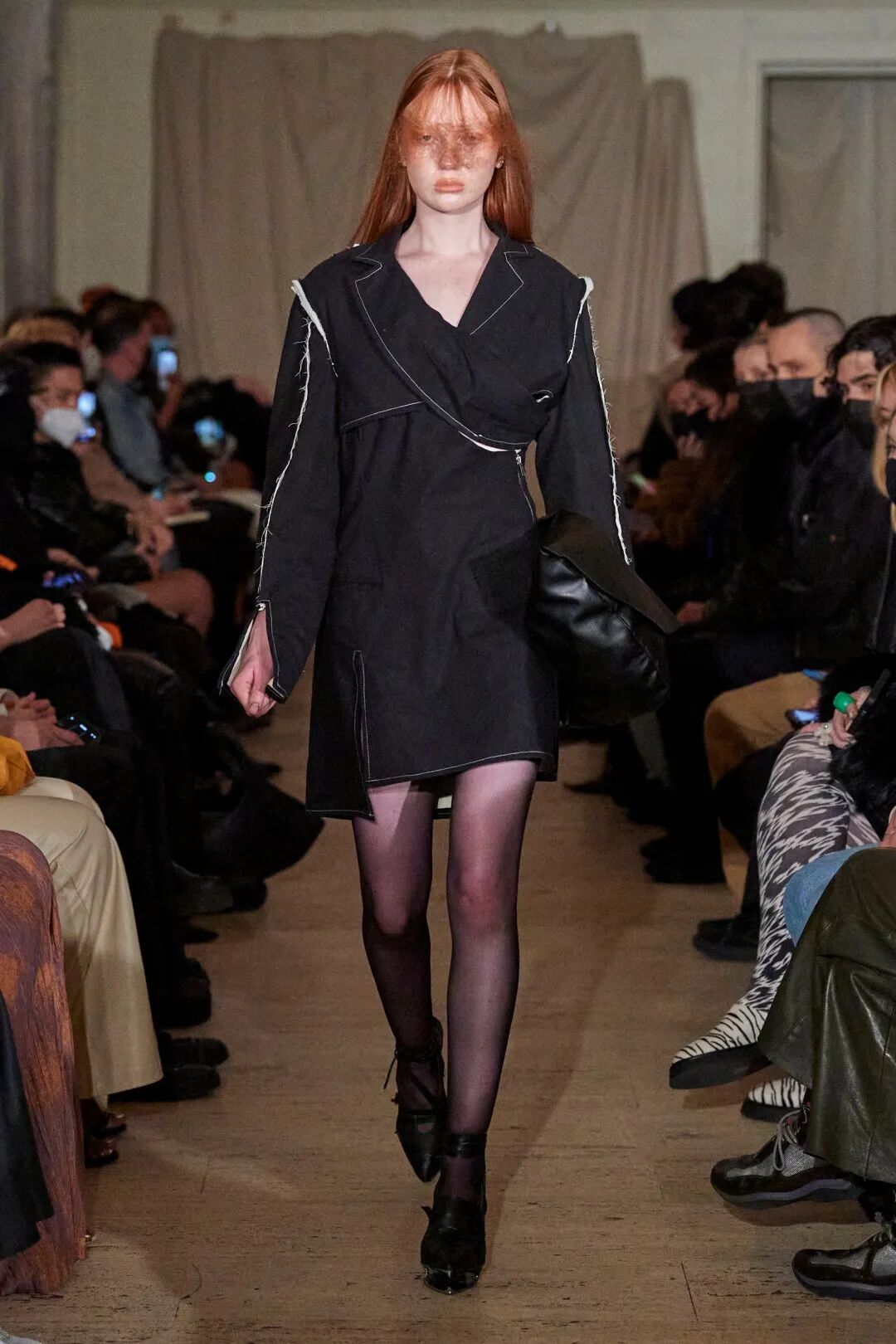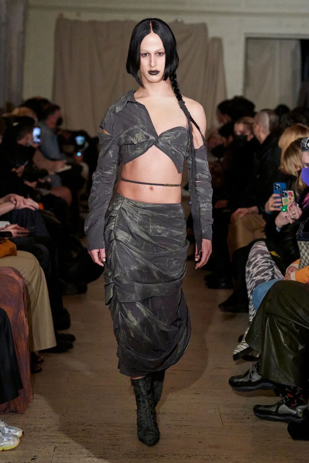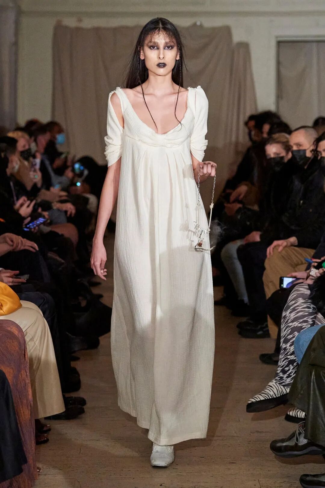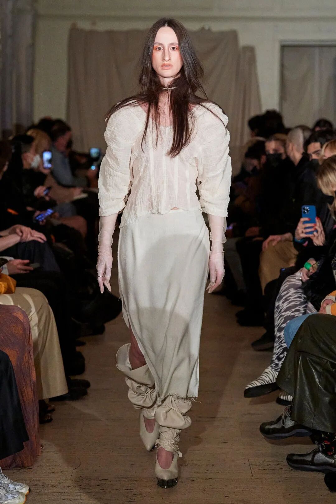 Elena Velez 以「Year 1: Maidenhood and Its Labour」为主题展开了自己2022秋冬的实体秀。她将秀场设置在Freehand Hotel,平常为酒吧的Georgia Room变成了一个简单的空间,伴随着“She was a disgrace to all women”的音乐,秀拉开了序幕。