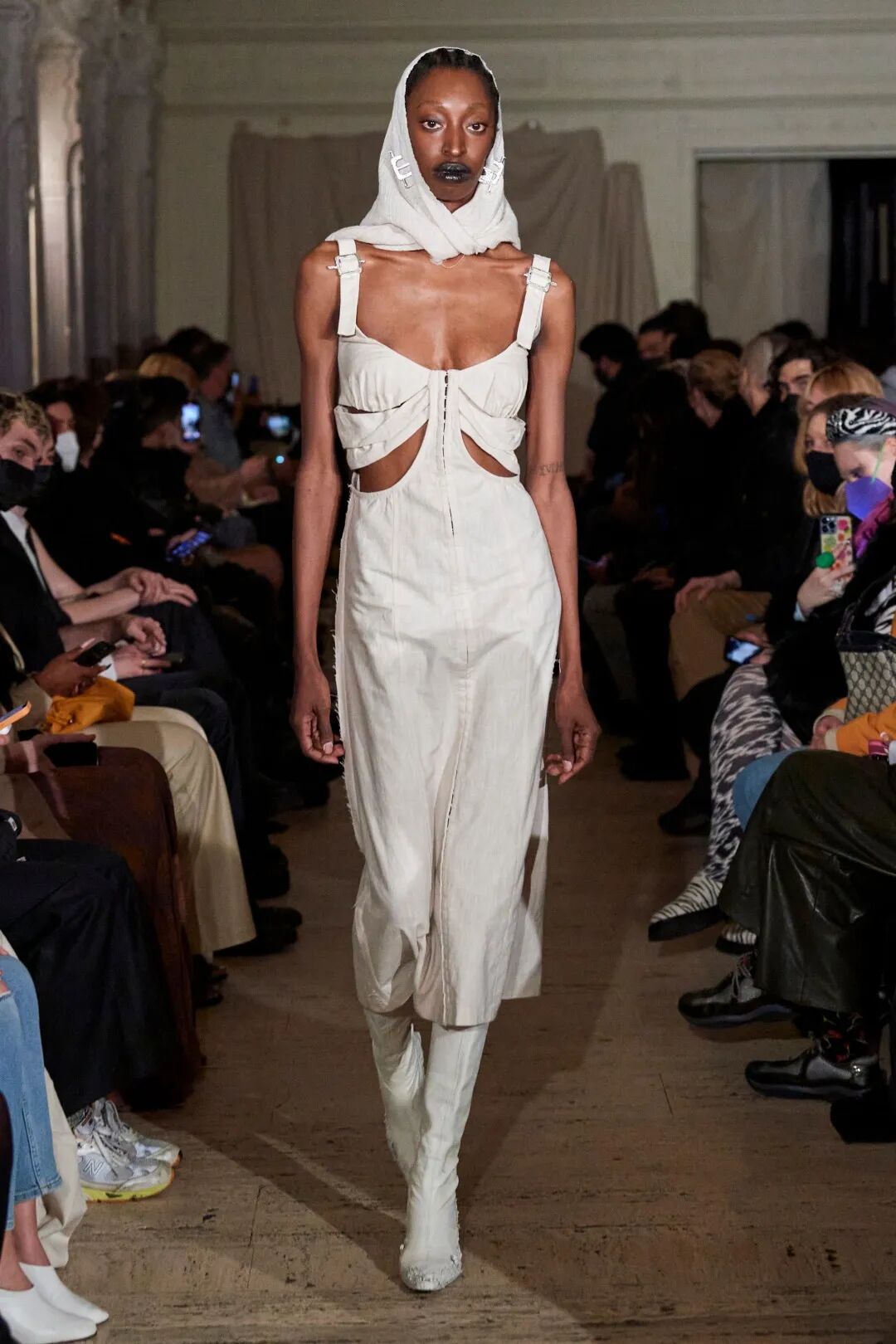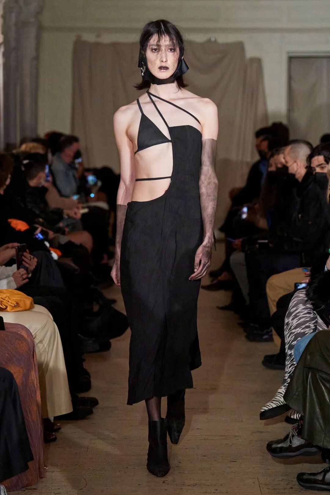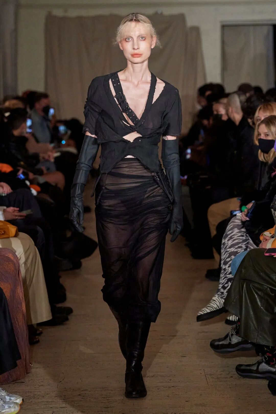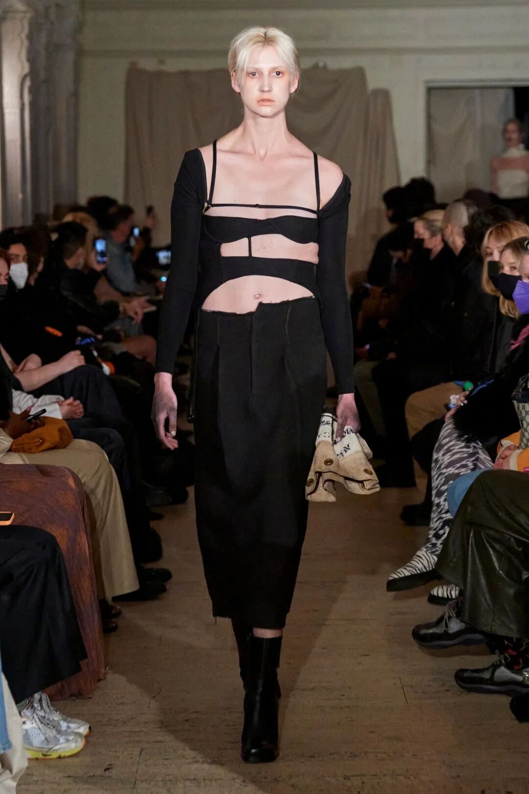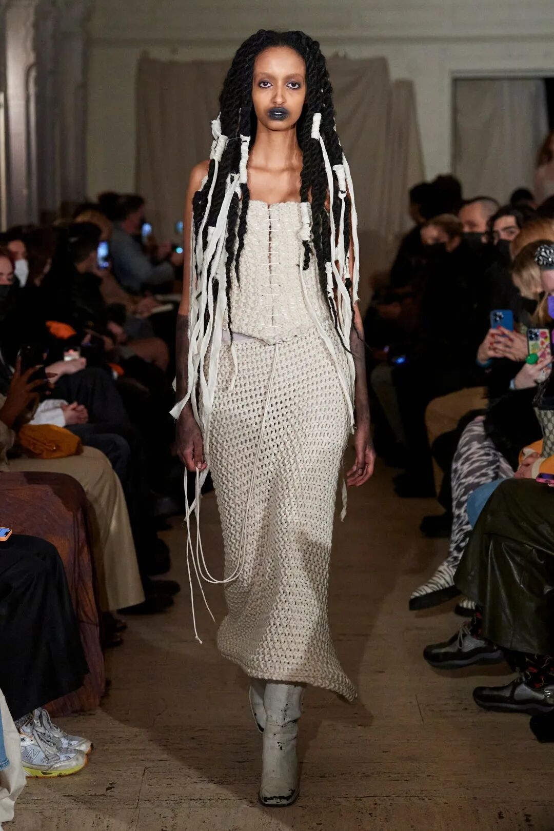 Elena Velez 以「Year 1: Maidenhood and Its Labour」为主题展开了自己2022秋冬的实体秀。她将秀场设置在Freehand Hotel,平常为酒吧的Georgia Room变成了一个简单的空间,伴随着“She was a disgrace to all women”的音乐,秀拉开了序幕。