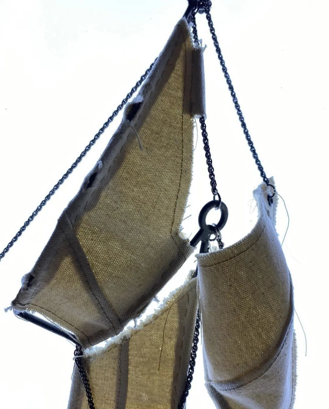 在新系列中,她尝试使用了许多工业化、坚韧的材料,类似于升级再造的船帆、层压军用帆布、针织棉、降落伞、皮革、亚麻布等等。其中升级再造的船帆材质是为了向母亲致敬,因为她是一个船长。