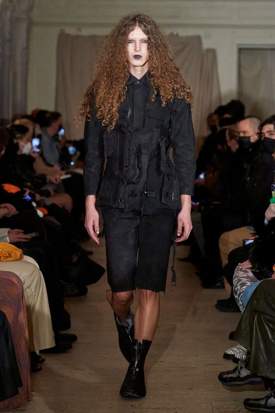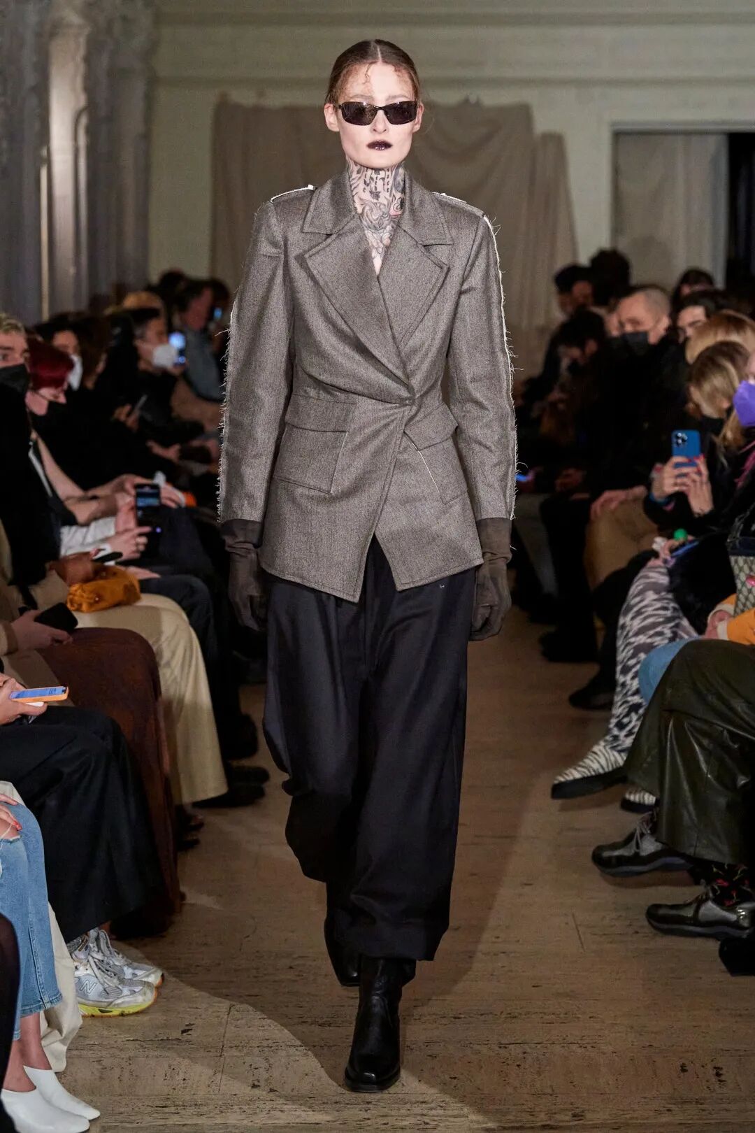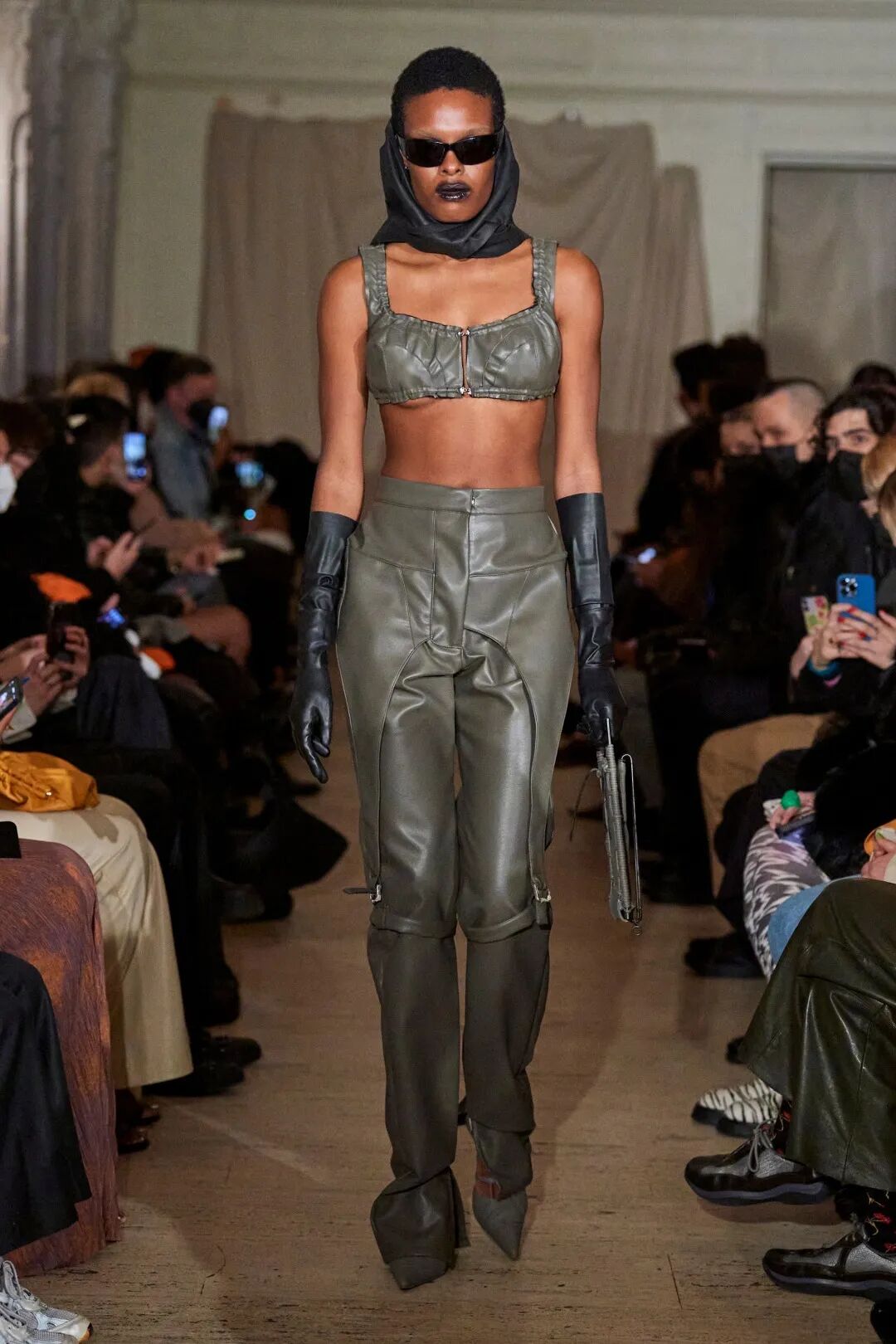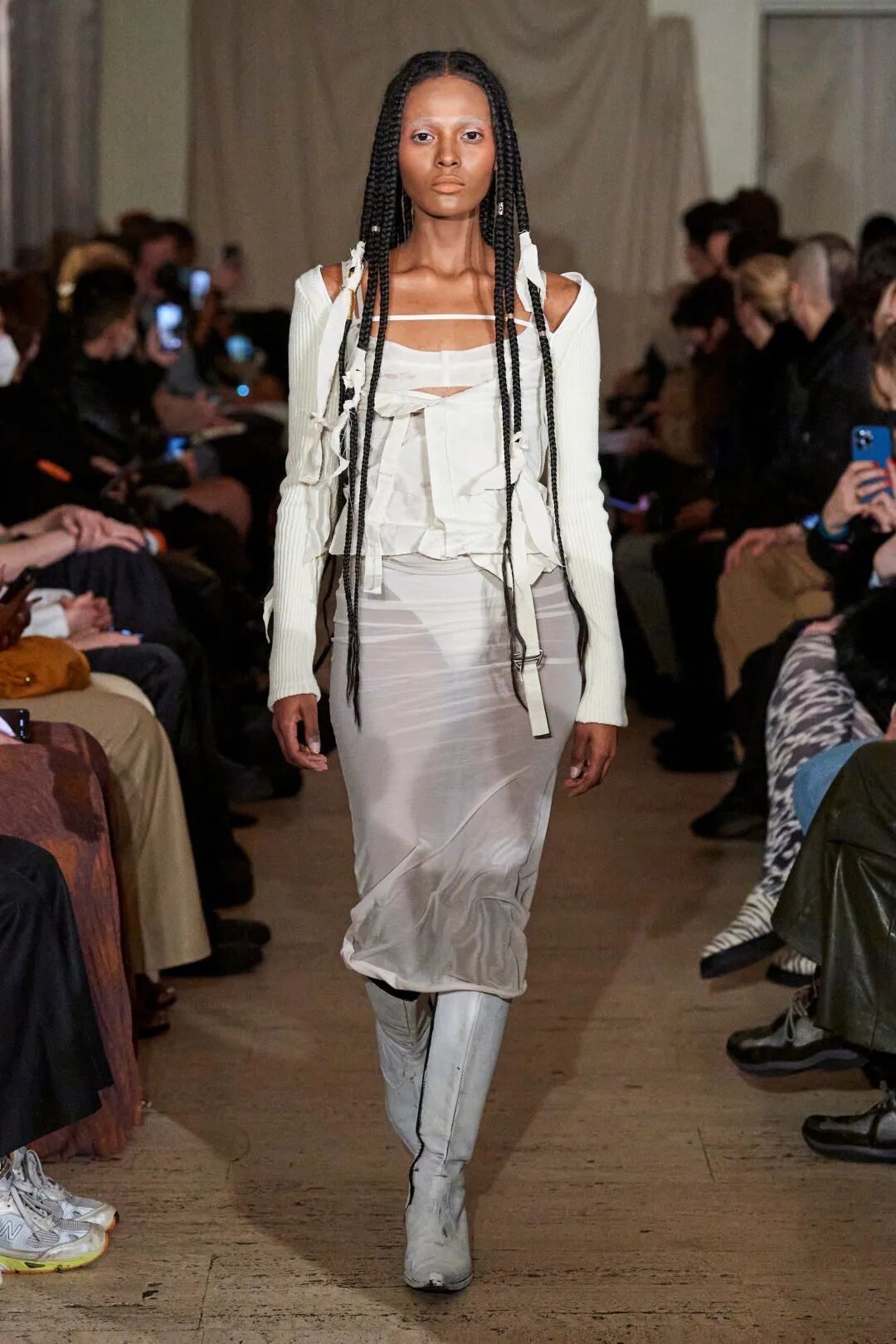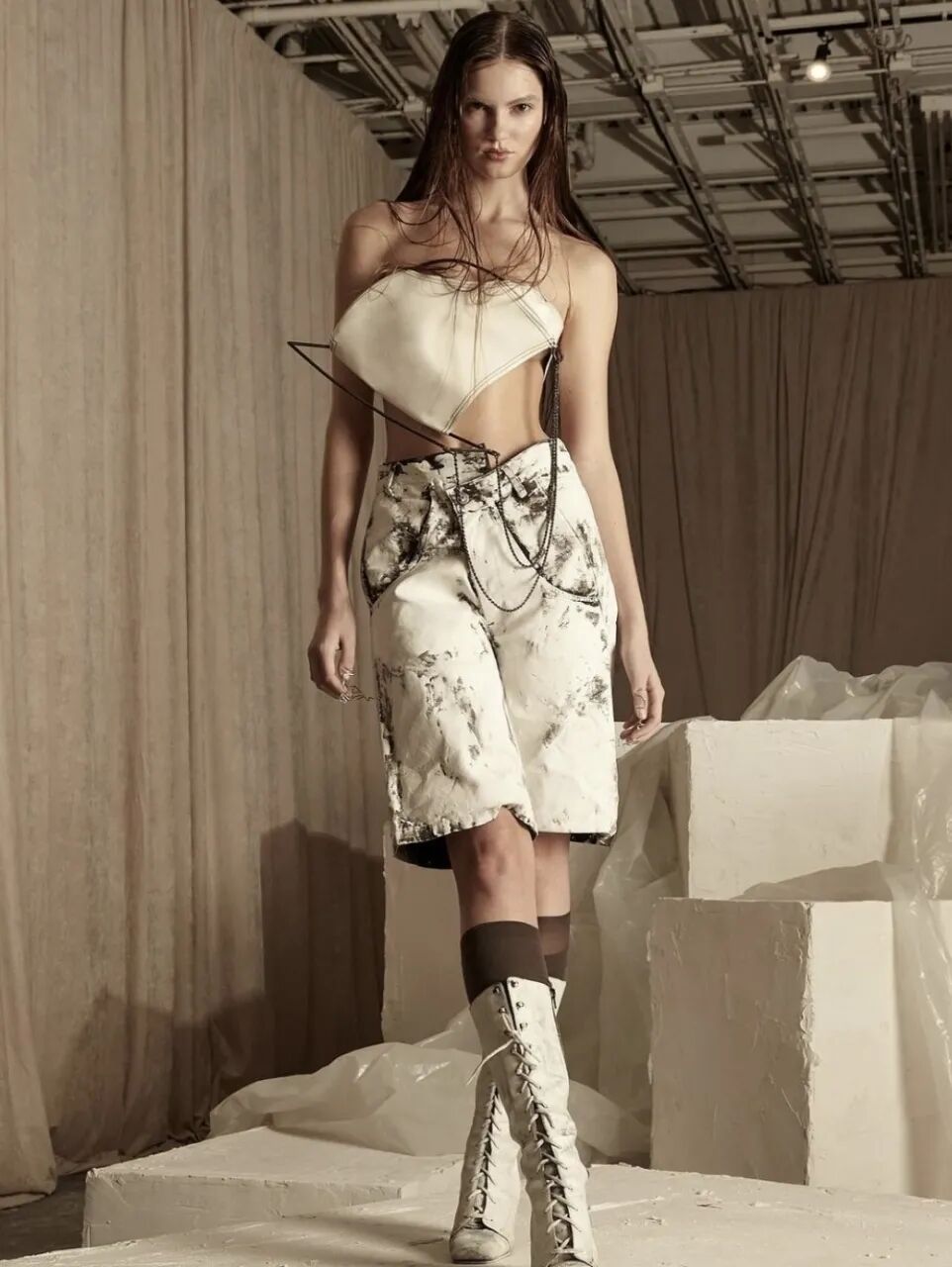与A-COLD-WALL*那种粗狂的工业风不同,Elena Velez将浪漫主义的火种播撒在了金属与粉尘中,解构主义的加持更是将服装以不同姿态展现,让人眼前一亮。