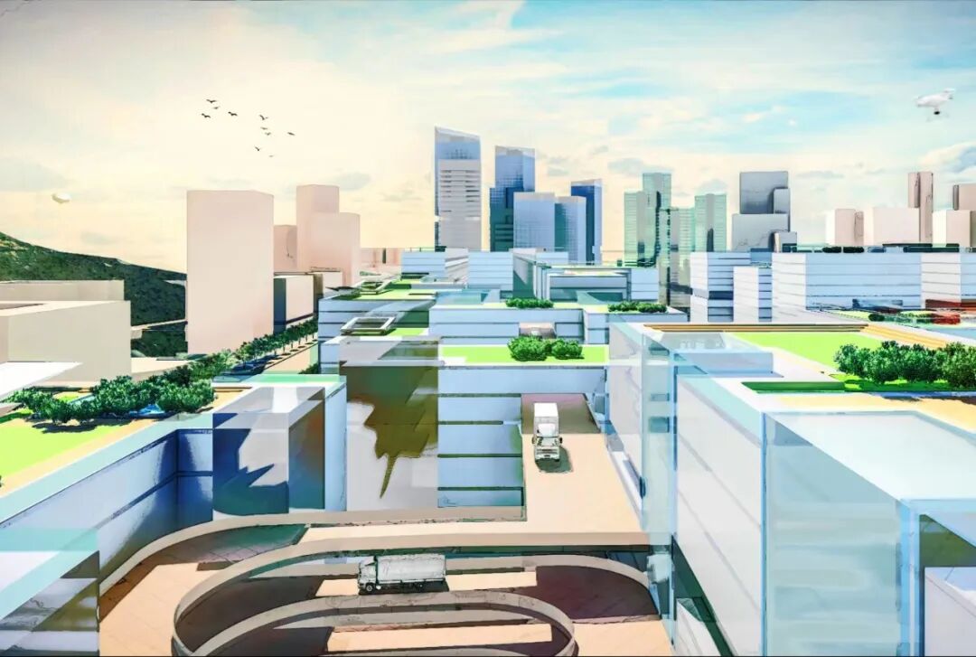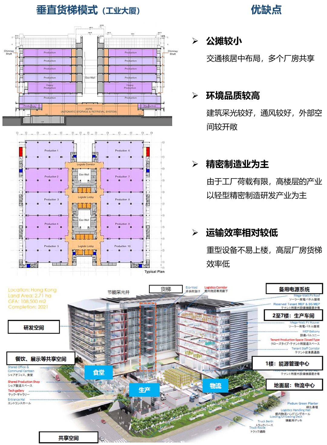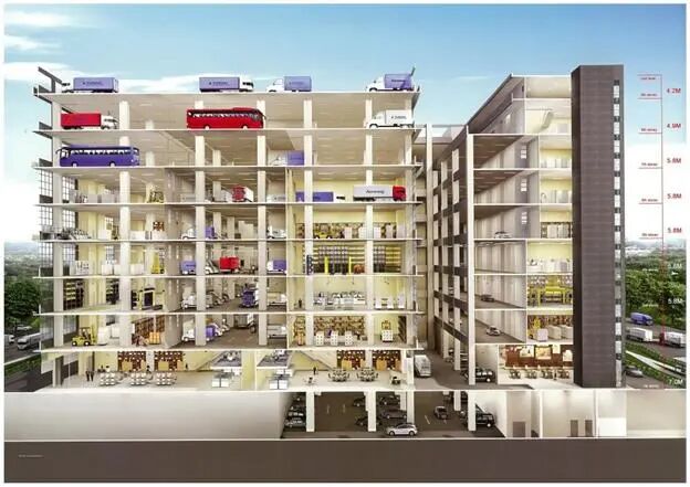 高架平台:通过平台货车可根据需要到达多个楼层,能提高运输效率,占地面积较大,较适合大型制造类,对环境品质有一定影响。