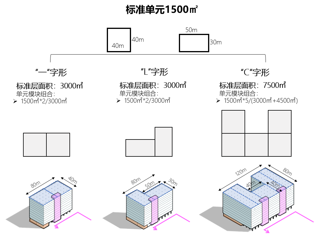 建议以1000-2000㎡为标准单元,适应生长线的变化,单元可根据实际企业需求灵活切分组合,并为未来产业迭代预留足够空间弹性。工业上楼建筑形态常见“一字型”、“L型”和“C字型”。