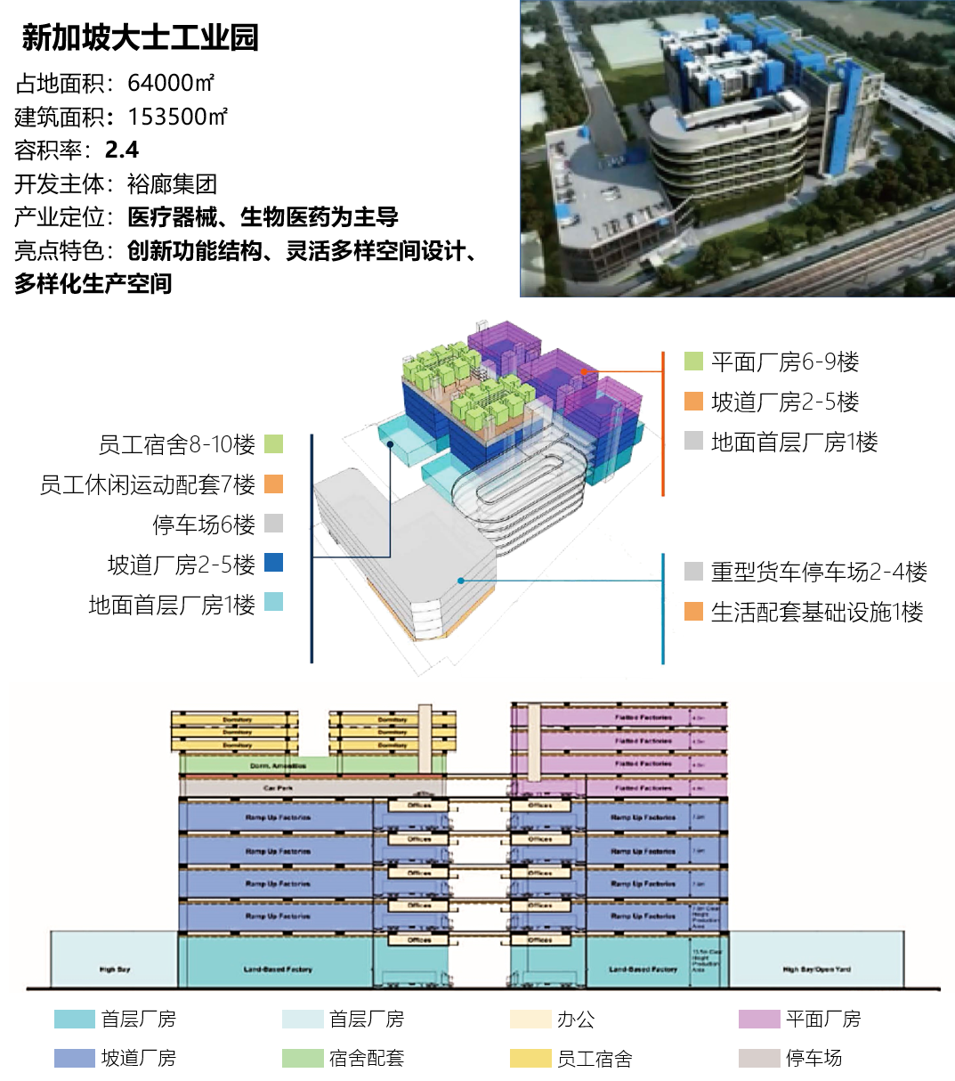 大士工业园是新加坡首个实现“生产-生活-娱乐”一体化的综合性工业项目。通过立体化地整合生产、办公、生活和休闲娱乐等多重功能,改园区实现了土地高效集约化利用。