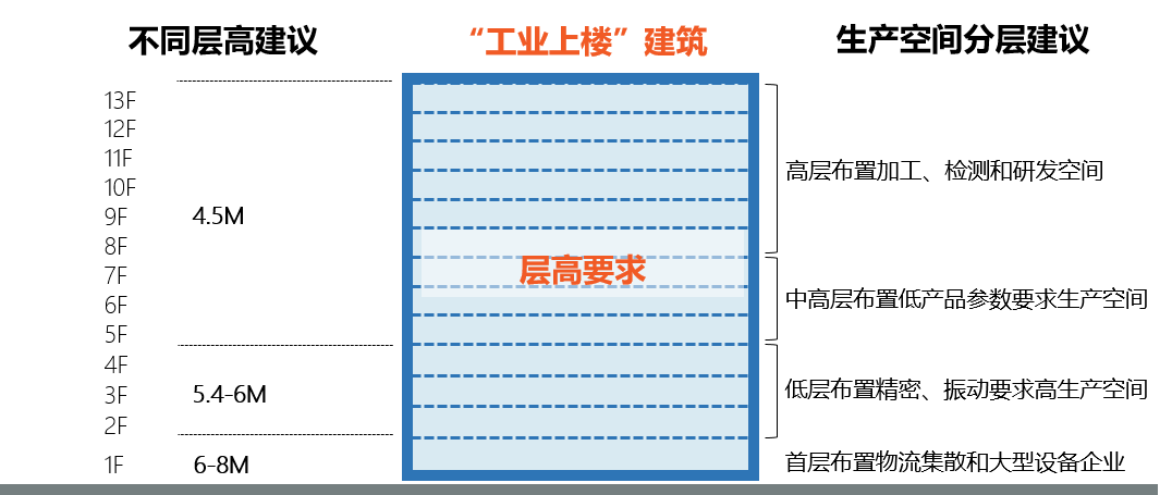工业层高规定各有不同。通常来说,厂房首层层高为6-8m,2至4层层高为5.4-6m,5层及以上层高为4.5m较为理想。这样也便于形成生产、实验以及研发办公的垂直分区模式。