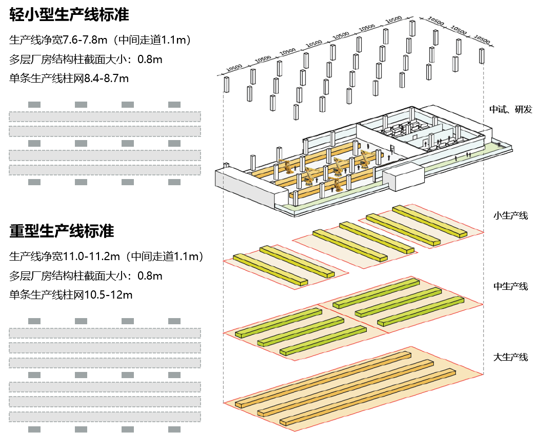 根据流水线布线长度,合理确定厂房柱网、长宽及标准层面积。基于调研企业对生产厂房的柱网需求,生产厂房的柱距不应小于8.4m。为保证生产使用的灵活性,鼓励采用8.7m*10.5m的柱网结构,满足从标准生产线到大型生产线的灵活通用性。