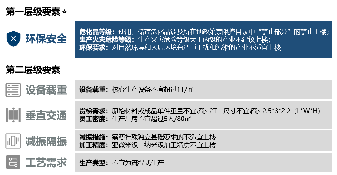 将各产业具体生产环节置入五要素模型筛选,可判断该产业是否适宜上楼生产。