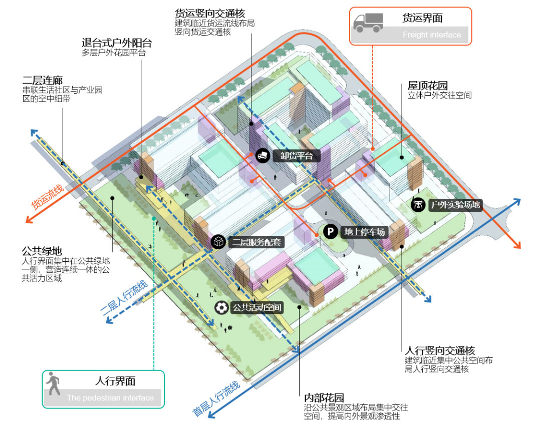 实际园区设计中应考虑客货分流的交通组织模式,将货流组织在园区外围,客流集中在园区内部,园区宜合理划分货运界面与人行界面,保证最高货运效率的同时,提升厂房的展示形象。