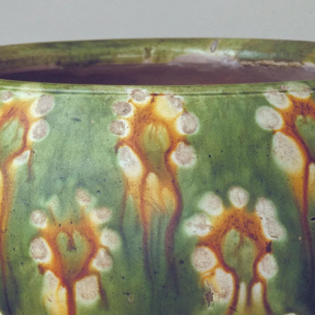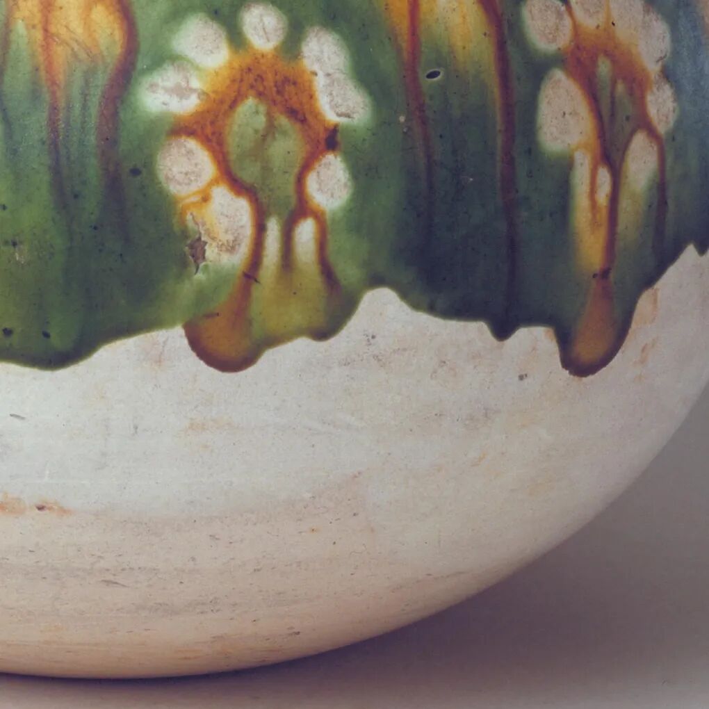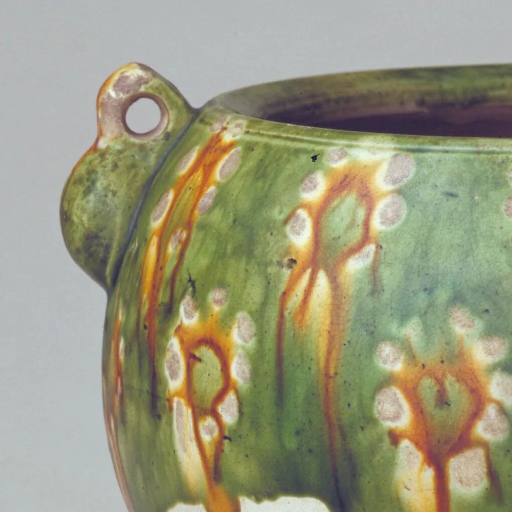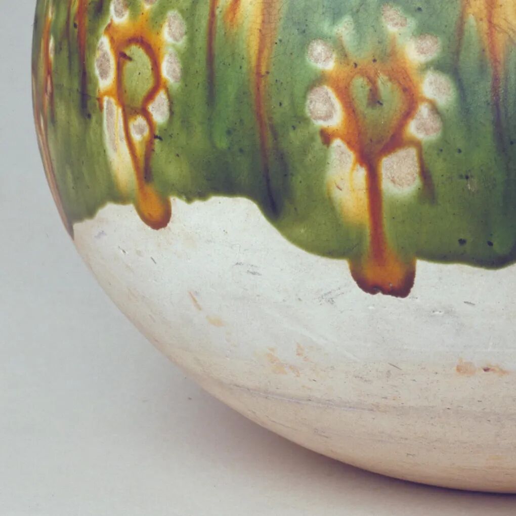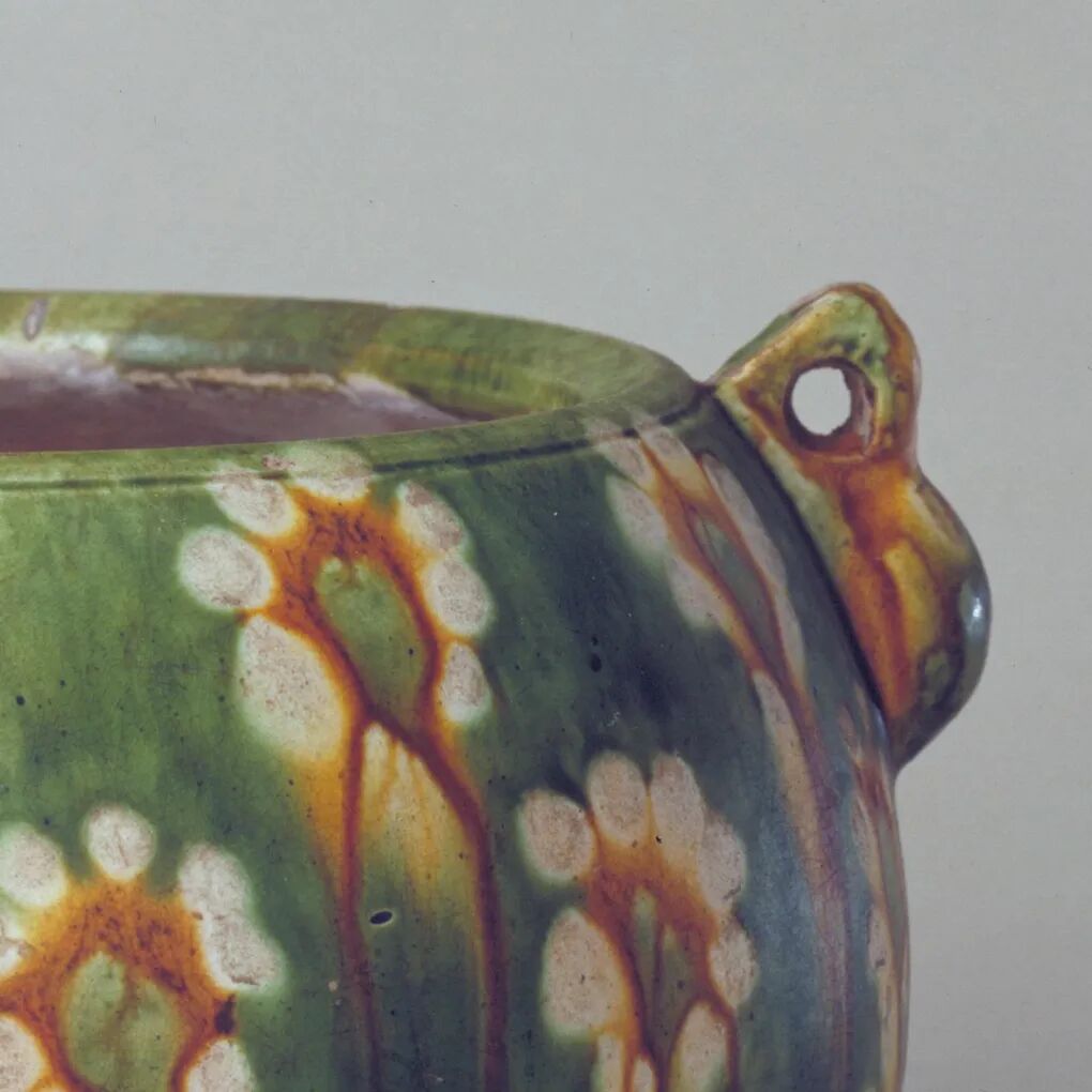 此罐器型虽小,但丰满端庄,模制成型的双系是唐三彩罐的一个主要特征。