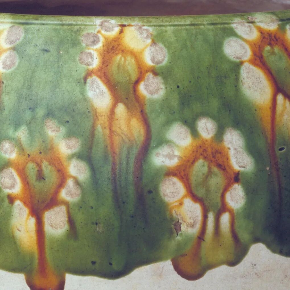 在巩县三彩窑址中曾采集到与此罐双系及彩斑相同的残片,由此可知此罐为河南巩县窑产品。