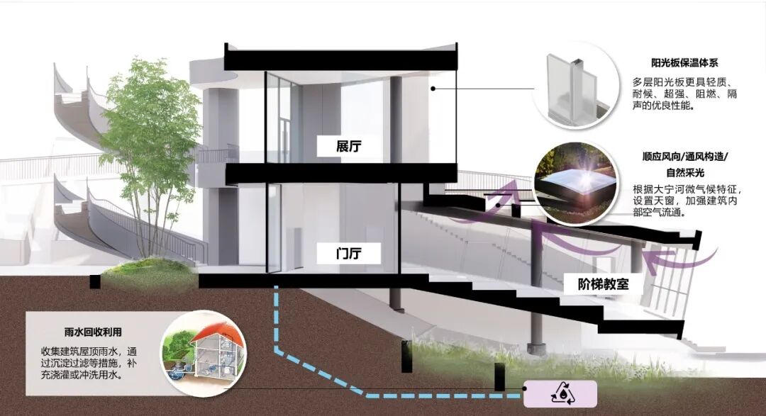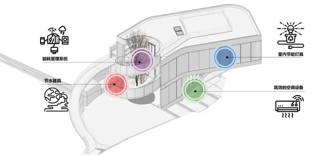 设计团队选用白色建筑材料,并尽可能减少玻璃等反光材料的使用,以减少热辐射。由于地处自然山地,项目缺乏相应的能源和水源供给。我们采用微型风能装置以及太阳能设施为项目供电,同时在设计中考虑了雨水收集和存储,以供给项目生活用水。