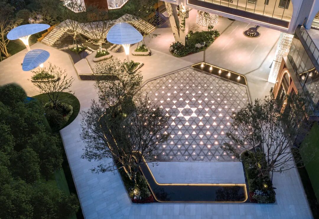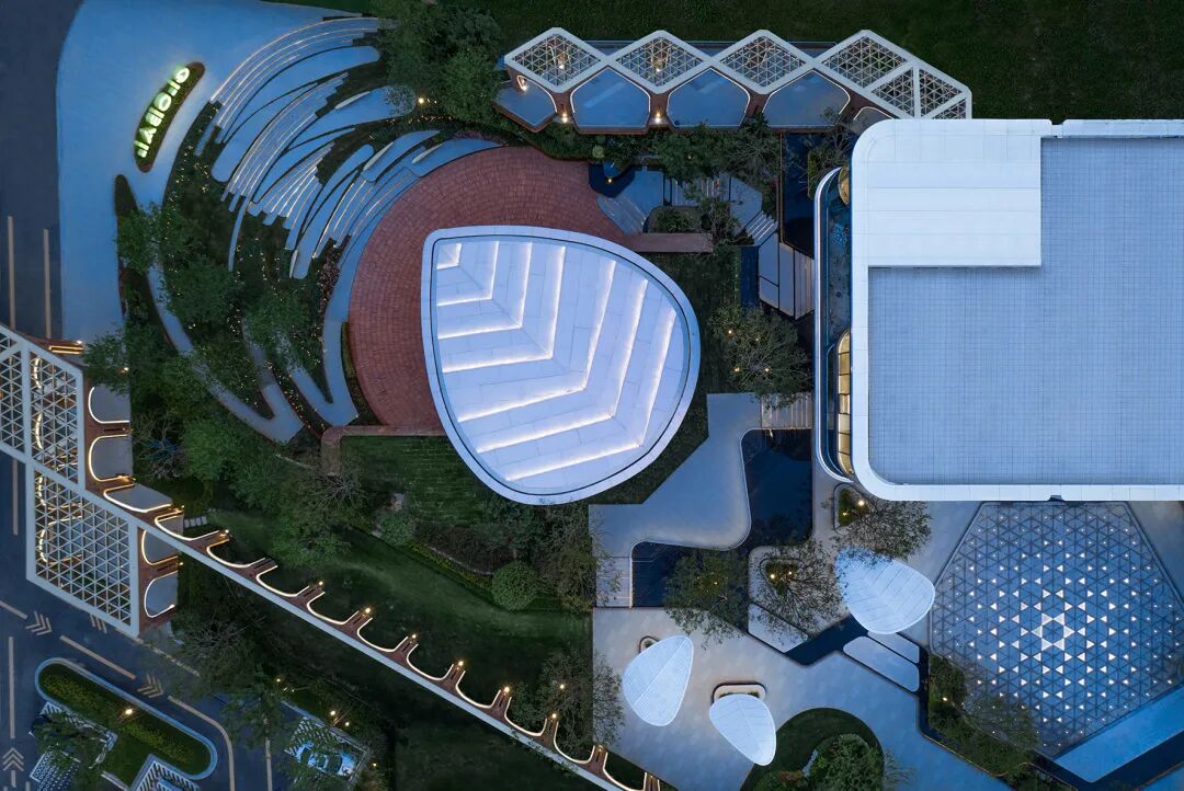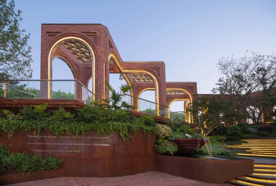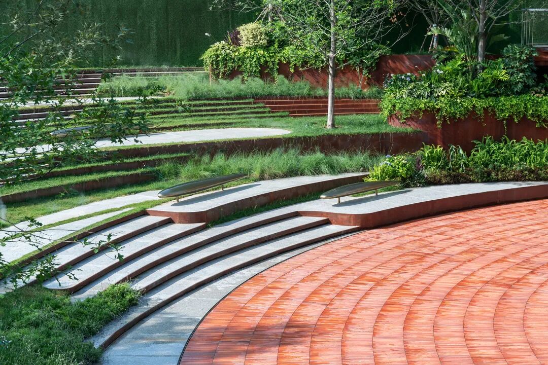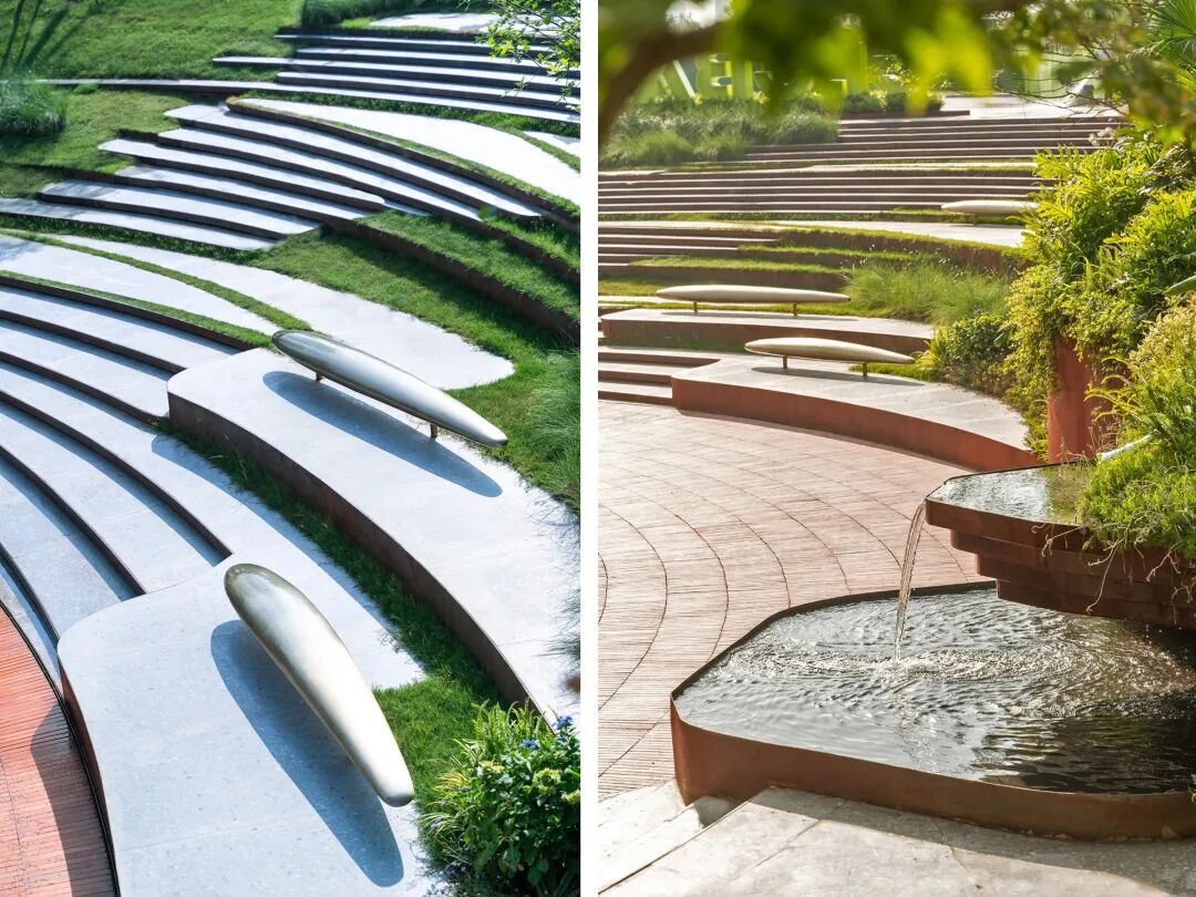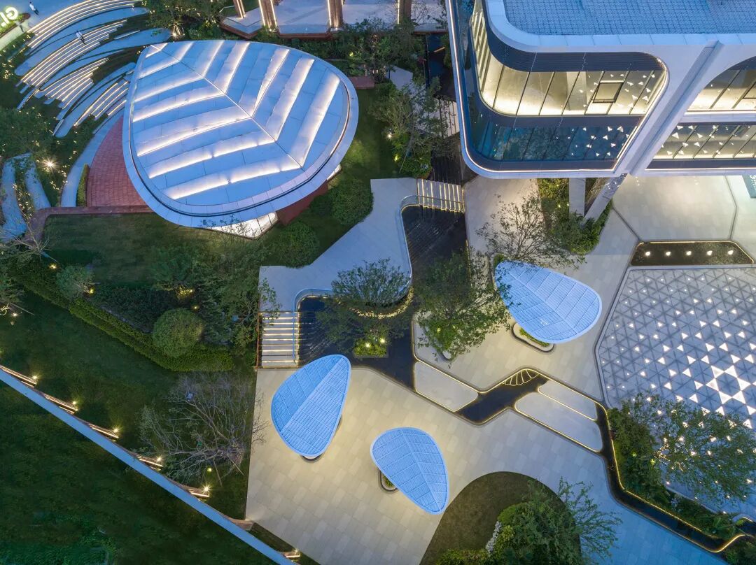 独特的弧形设计,层层递进,使空间呈现更多趣味性、多角度的体验,为居者创造了休息和思考的空间,促进着邻里共享与交融,重拾社区的群体归属感与参与感,“公园里的聚场”顺势而生。