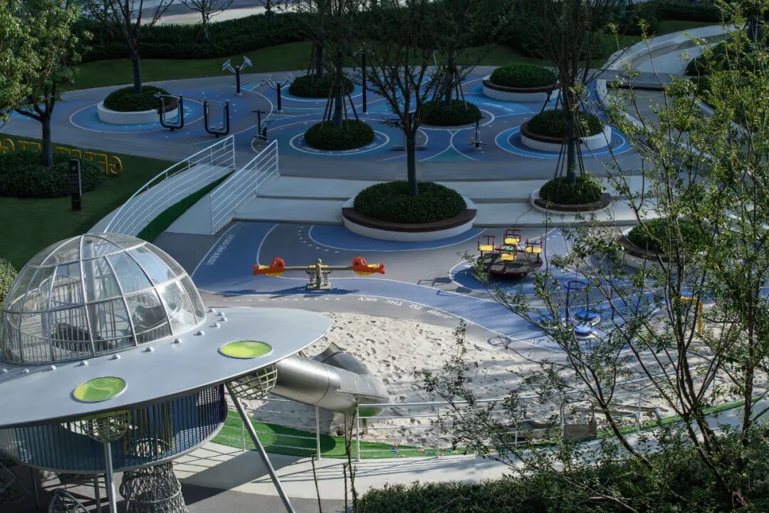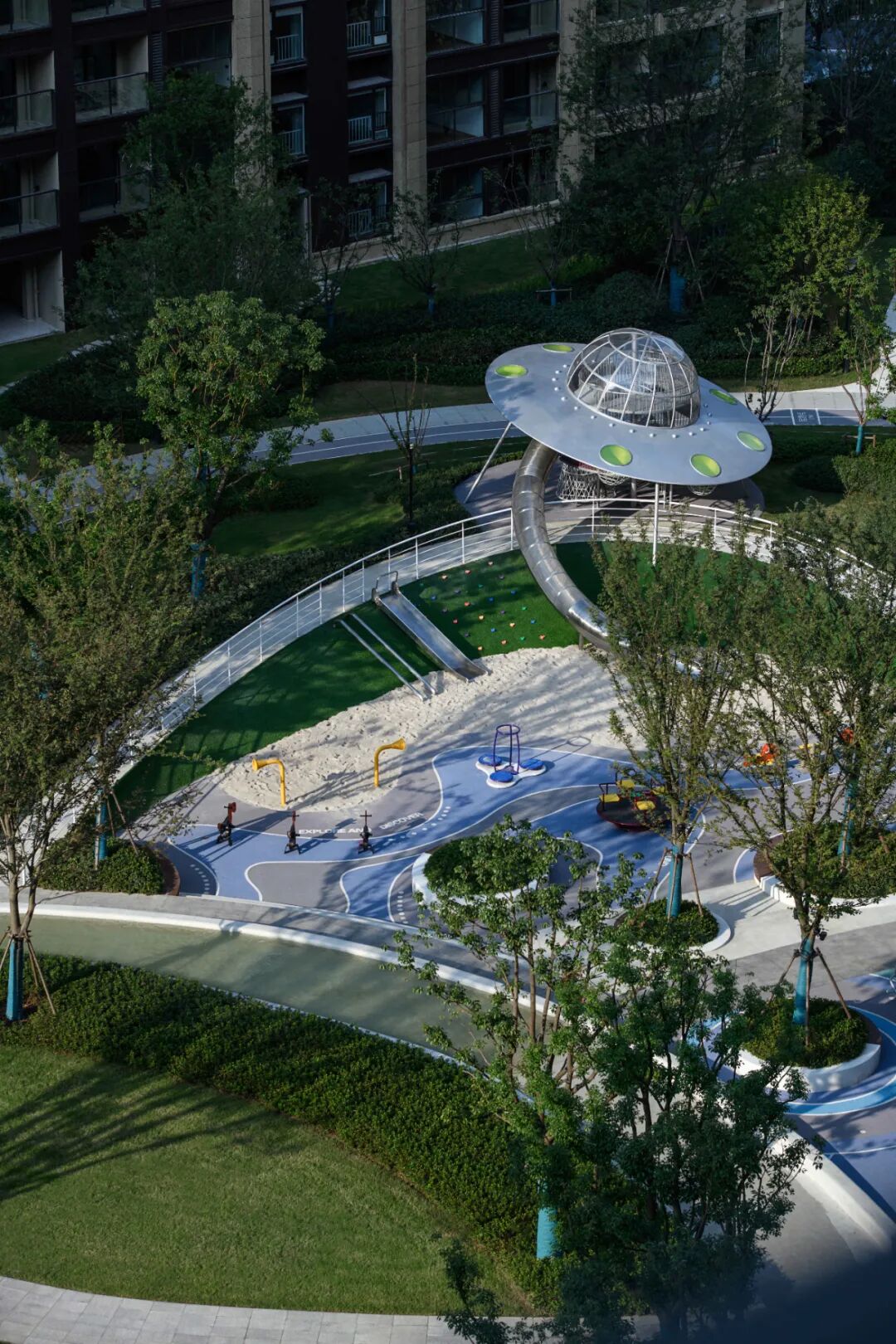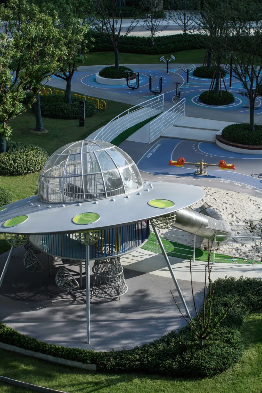 The starry sky park centered on UFO is equipped with a variety of amusement facilities. Children can spend an afternoon of fun here. A terrazzo water ring is set up around the central lawn, so that older children who don't need supervision can come to the lawn and have fun.