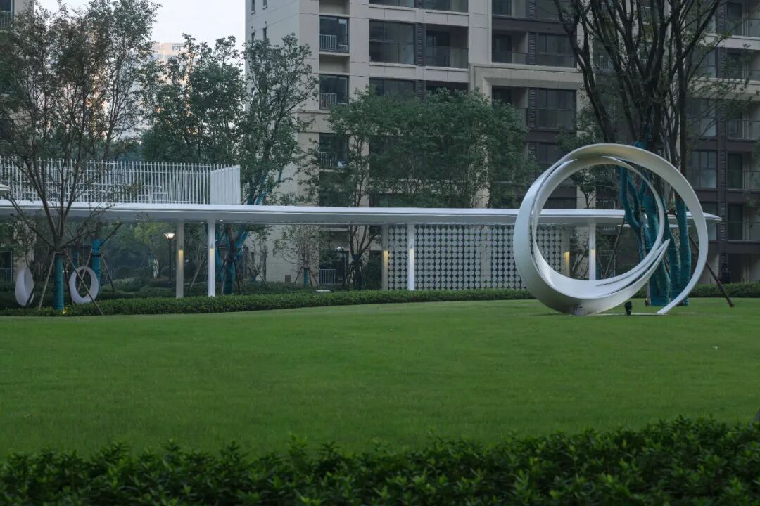 草坪边缘点缀高大乔木,中心设置了“时空之门”的环形雕塑。