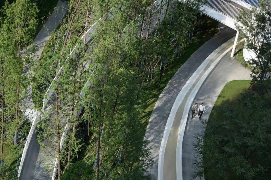 戏水环的水流宽度从大到小,通过高差保证了水流的流动性。用水磨石制作的高低起伏,有些区域可以戏水,有些区域可以从连桥经过,有些区域可以坐在池边休息。