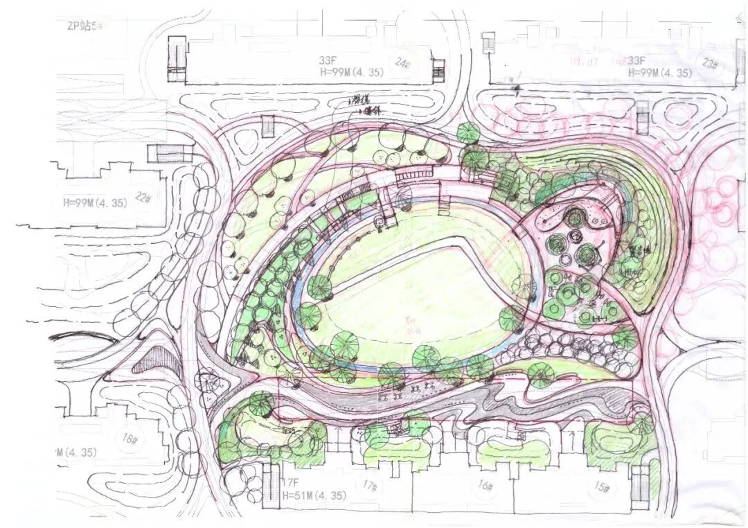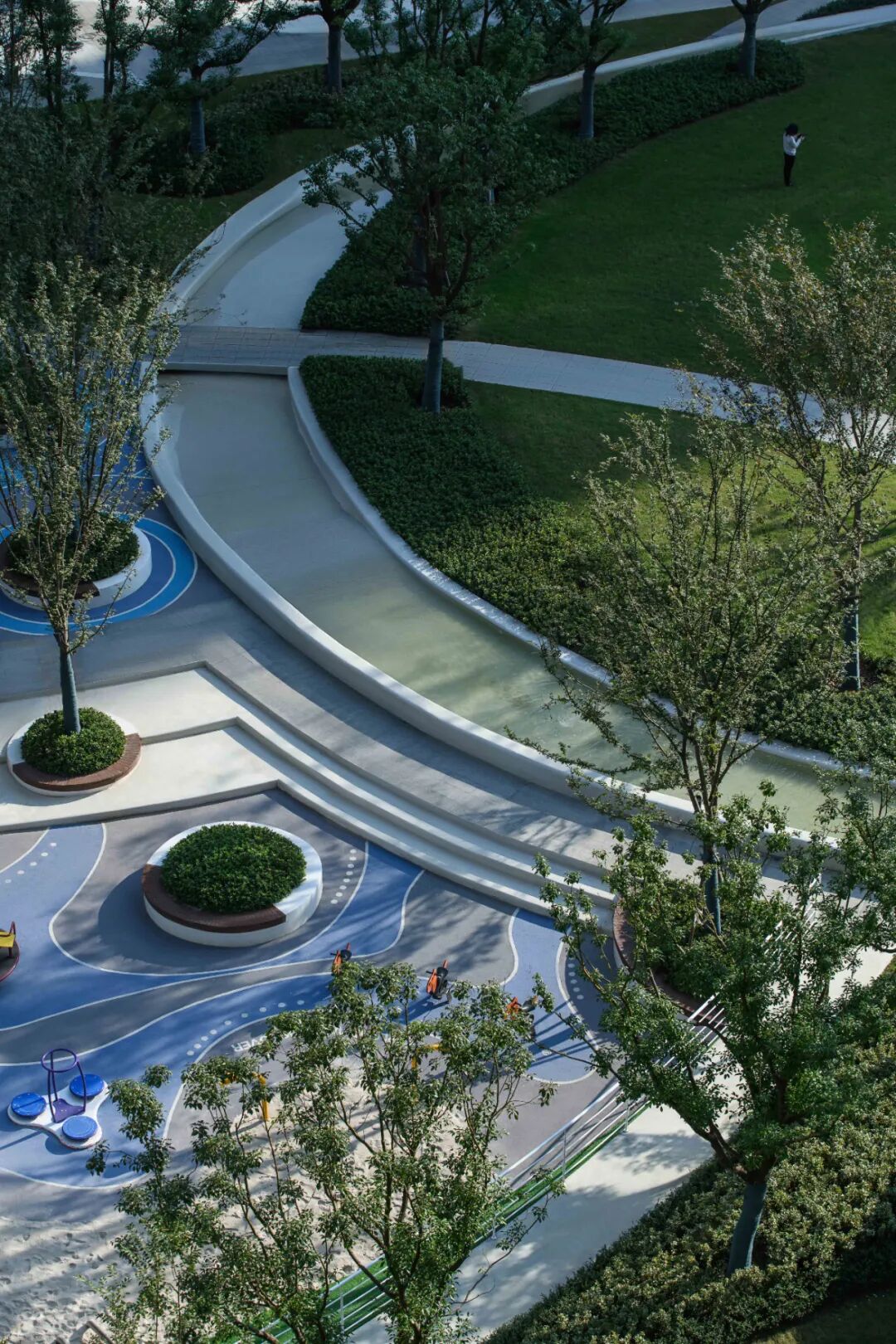 The core landscape area is centered on the park-scale sunny lawn, with all-age activity spaces distributed around it, to become a composite function space.