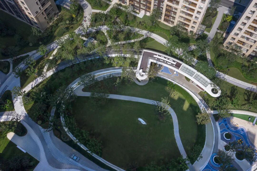 The lawn area is surround the elderly fitness area, the children's play area (starry sky park), the community lounge and the sky bridge.