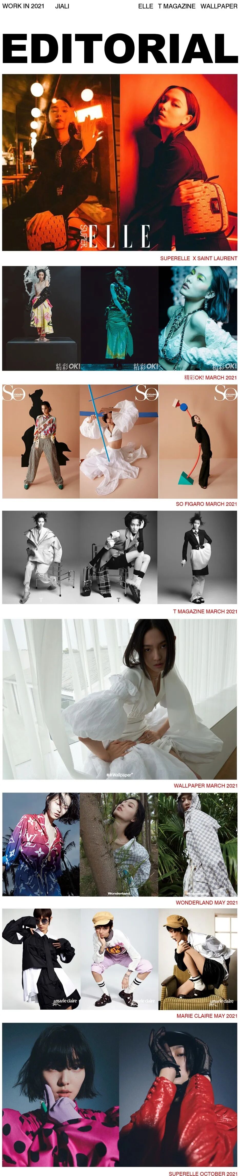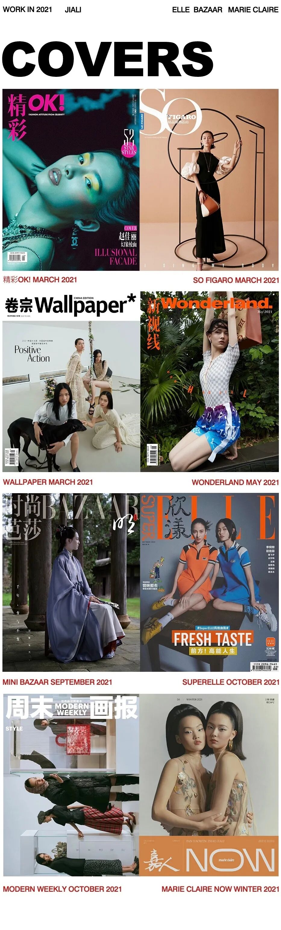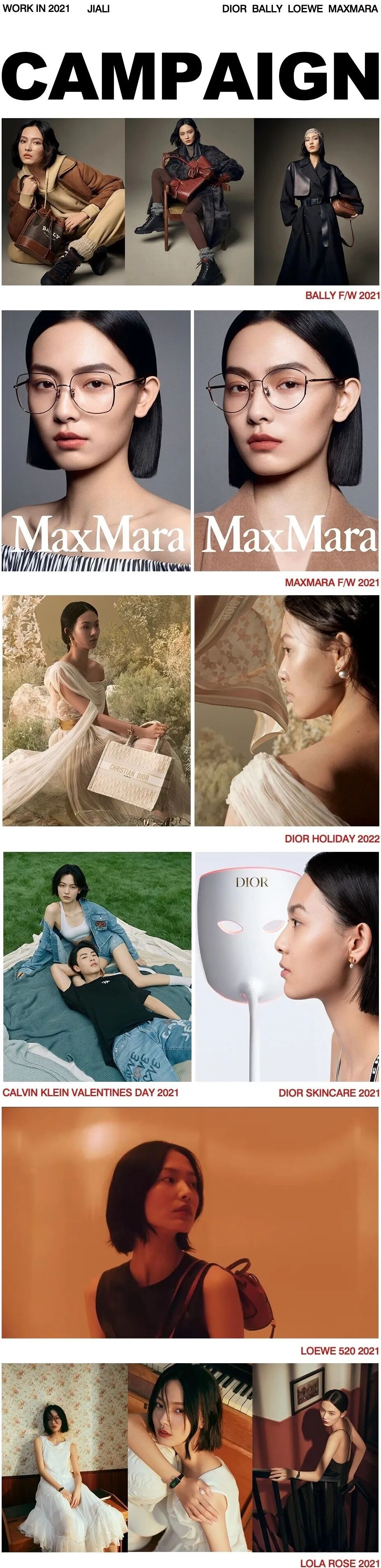 受疫情影响,2021年赵佳丽的大部分工作都在国内完成。她在2021年一共参与了8场封面的拍摄,收获7个广告,走秀7场,并与 Loewe、Prada、Celine、Louis Vuitton、Saint Laurent、Cartier 等多个品牌保持着密切合作关系。