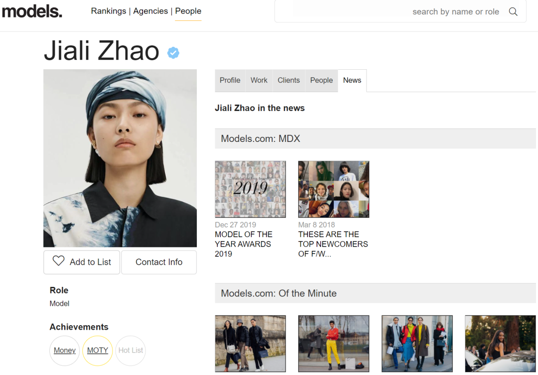 在世界模特网(Models.com)中,我们可以看到找赵佳丽和何穗、雎晓雯、李静雯、贺聪、汪 曲攸等前辈一同跻身 The Money List 中的