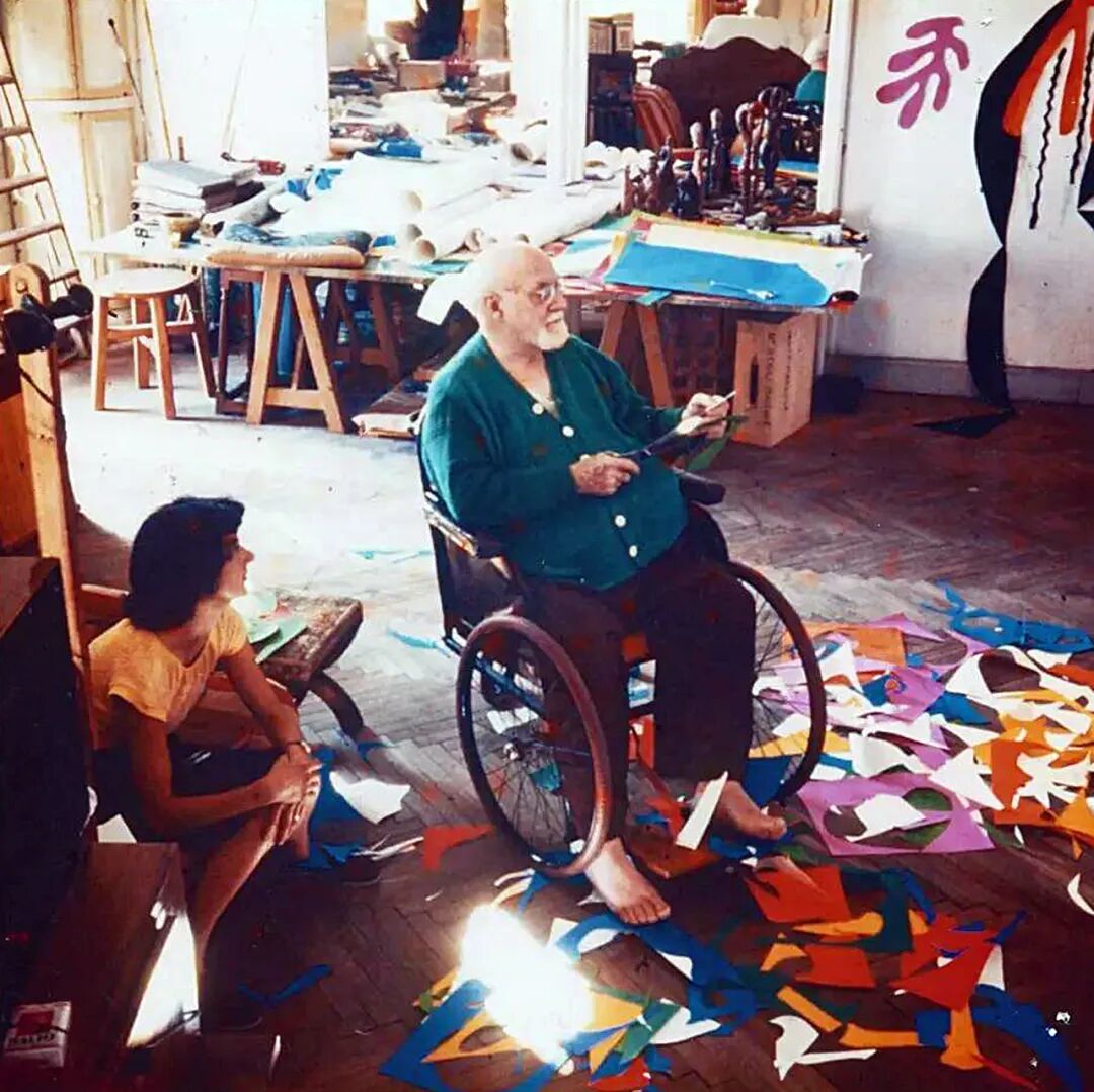 偶然翻看到一些画家在画室中的照片。在宽大的画室里,亨利·马蒂斯蓄着整齐的胡须,绅士般地端坐在轮椅上,四周五颜六色的纸片,似花瓣散落在地上,旁有一美女倾下身姿,拿起一张蓝色的纸片,冲着他微笑。