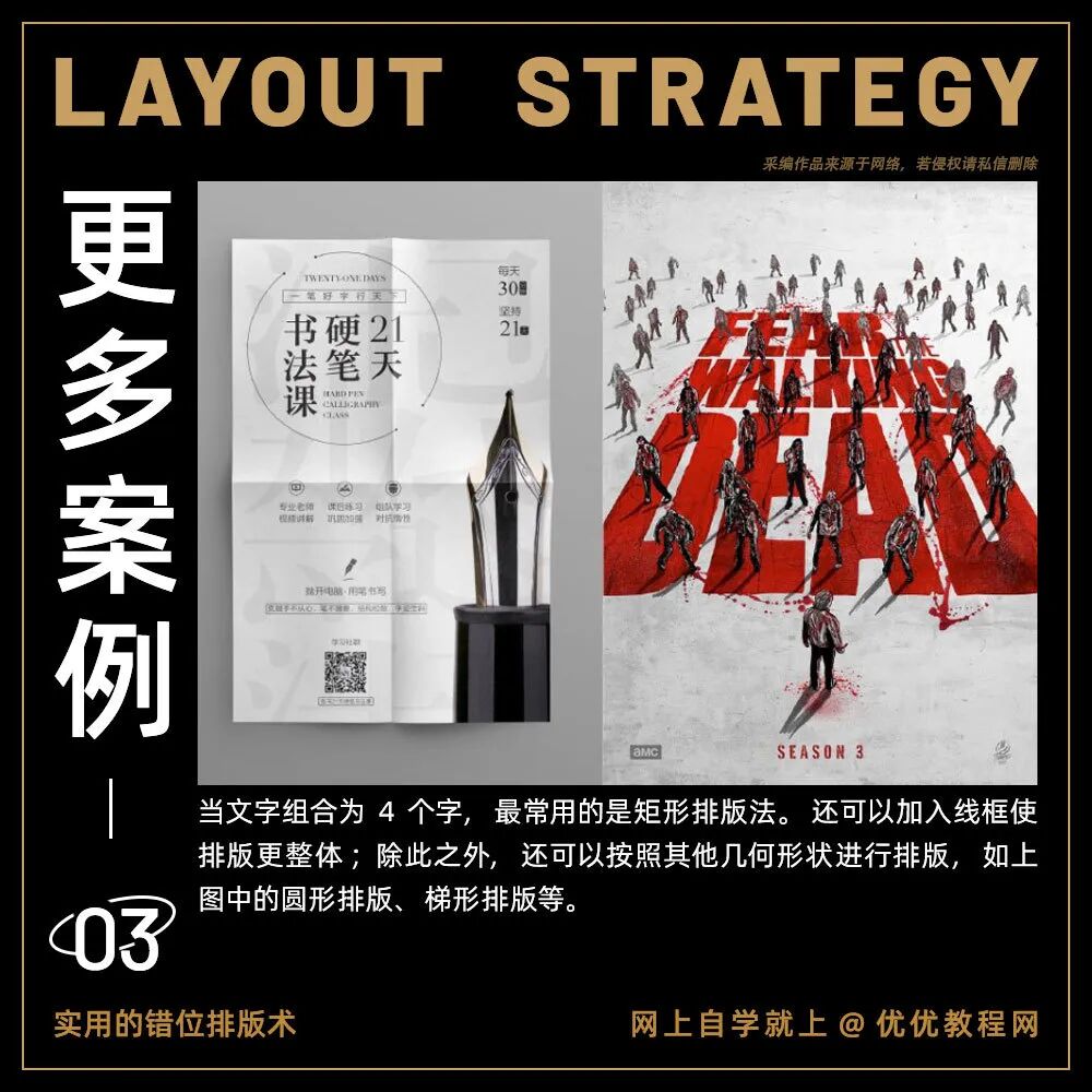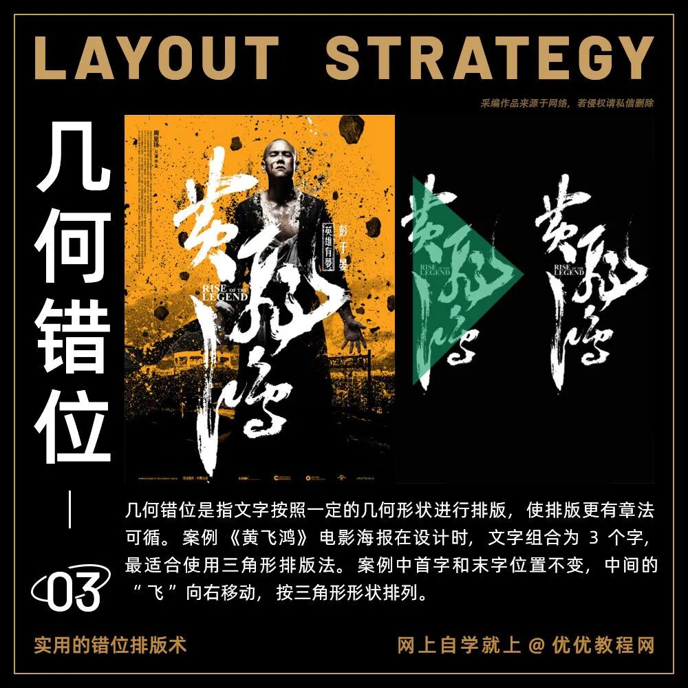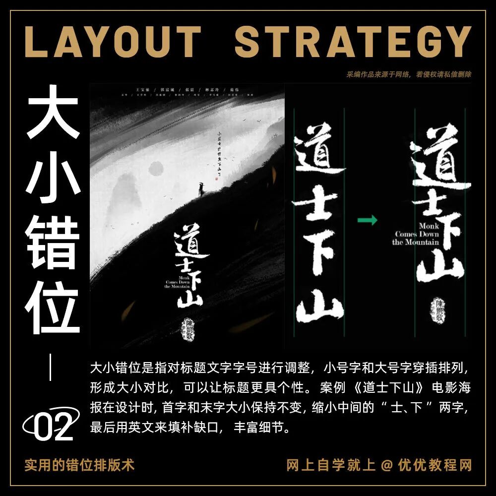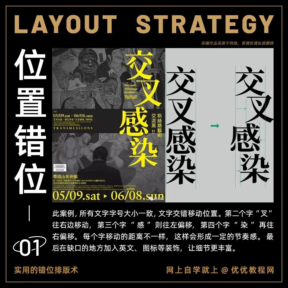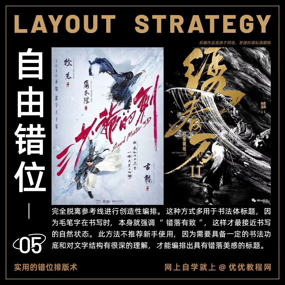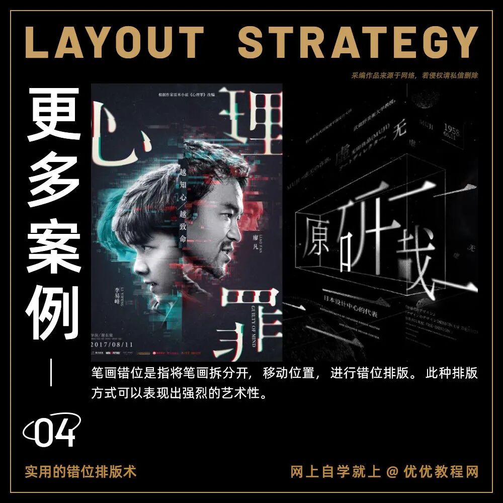 我们平时在做设计的时候一定会遵循四个设计的基本原则:分别是亲密性、对齐、重复和对比。其中对齐,特别是居中对齐,是初学者最常使用的一种设计方式,看起来很安全,也很舒服,符合大众审美。但是今天要给大家分享另外一种排版方式,也是著名设计师黄海创作的电影海报时常用的方式:错位排版。今天分享的这5个错位排版技巧分别用案例进行讲解,让你“对不齐”的设计也好看!教你打造个性标题!
