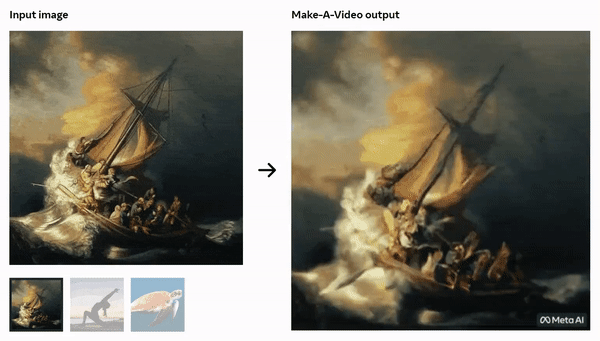 除了可以根据文本描述生成视频,Make-A-Video 还可以仅根据一张图片就生成视频、为两张图片填充中间的动作,以及根据原有的视频,生成同样类型的视屏变体。