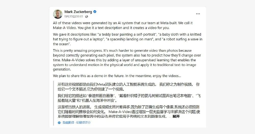Make-A-Video 是由 Meta AI(Facebook)研发的一最新的 AI 工具,由创始人马克·扎格伯格 9 月 29 日在 Facebook 上宣布推出。作用是可以根据文本描述直接生成视频,名字则是与 Meta AI 之前推出的文本-图像模型 Make-A-Scene 保持一致,非常直白。