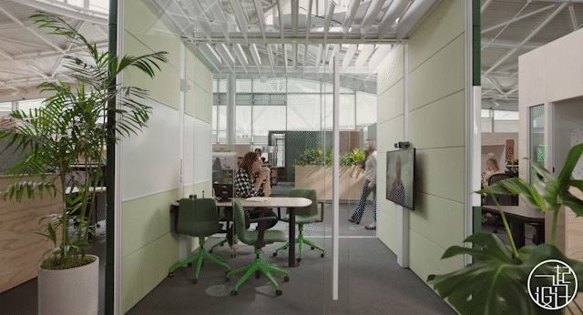 上层设计成半开放式的办公室环境,整个空间全都是「无天花板」设计,以此来确保内部空间里有恒定的光照,还能减少开灯降低能源消耗。