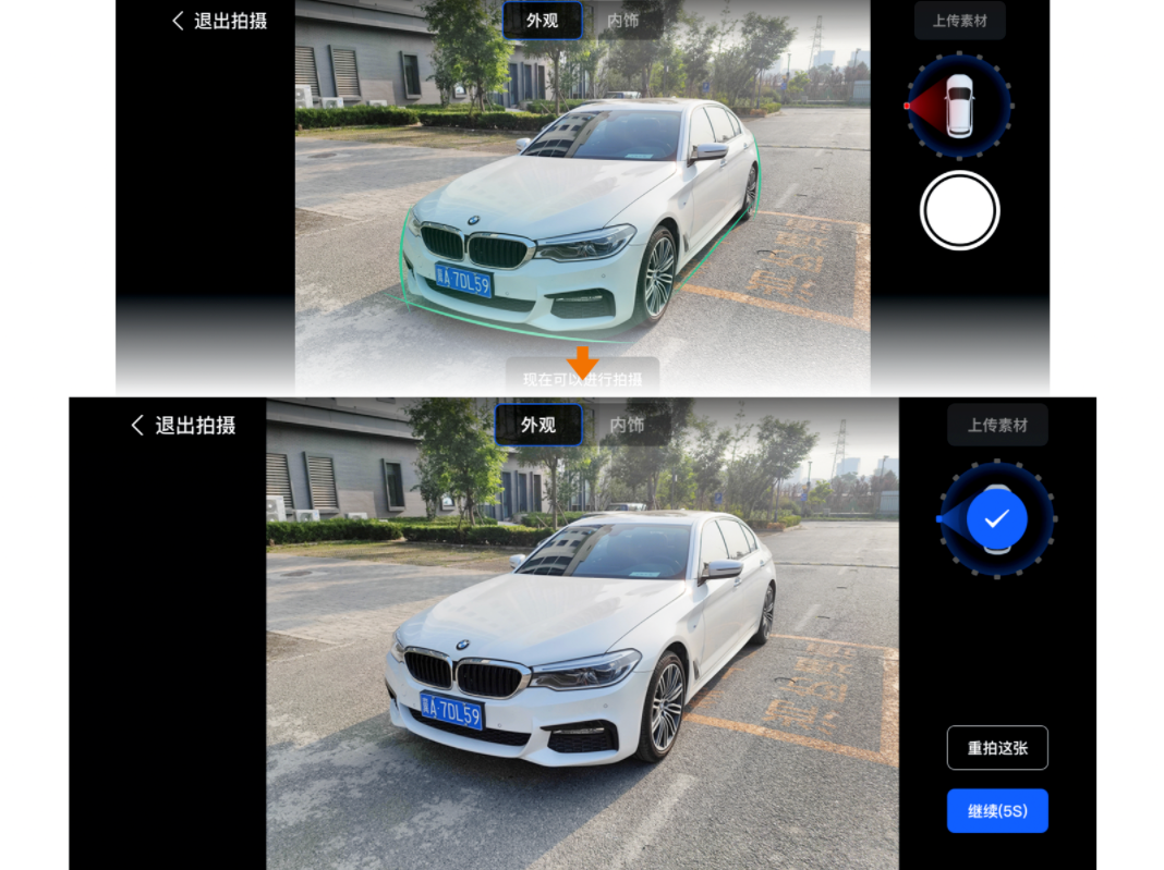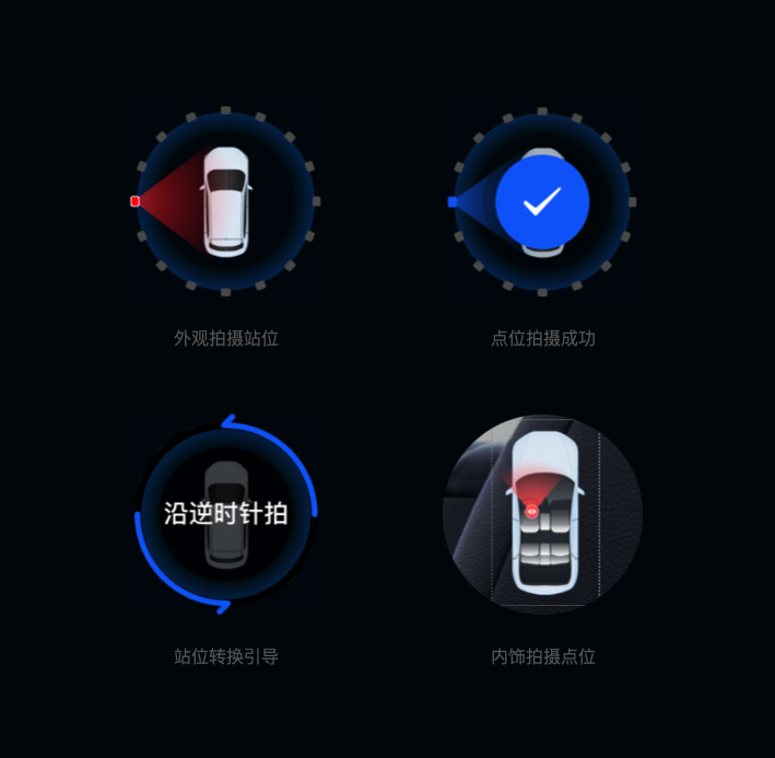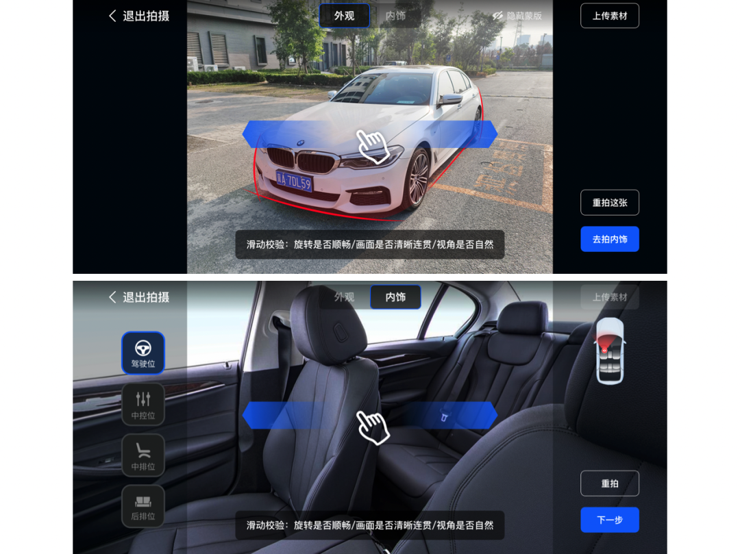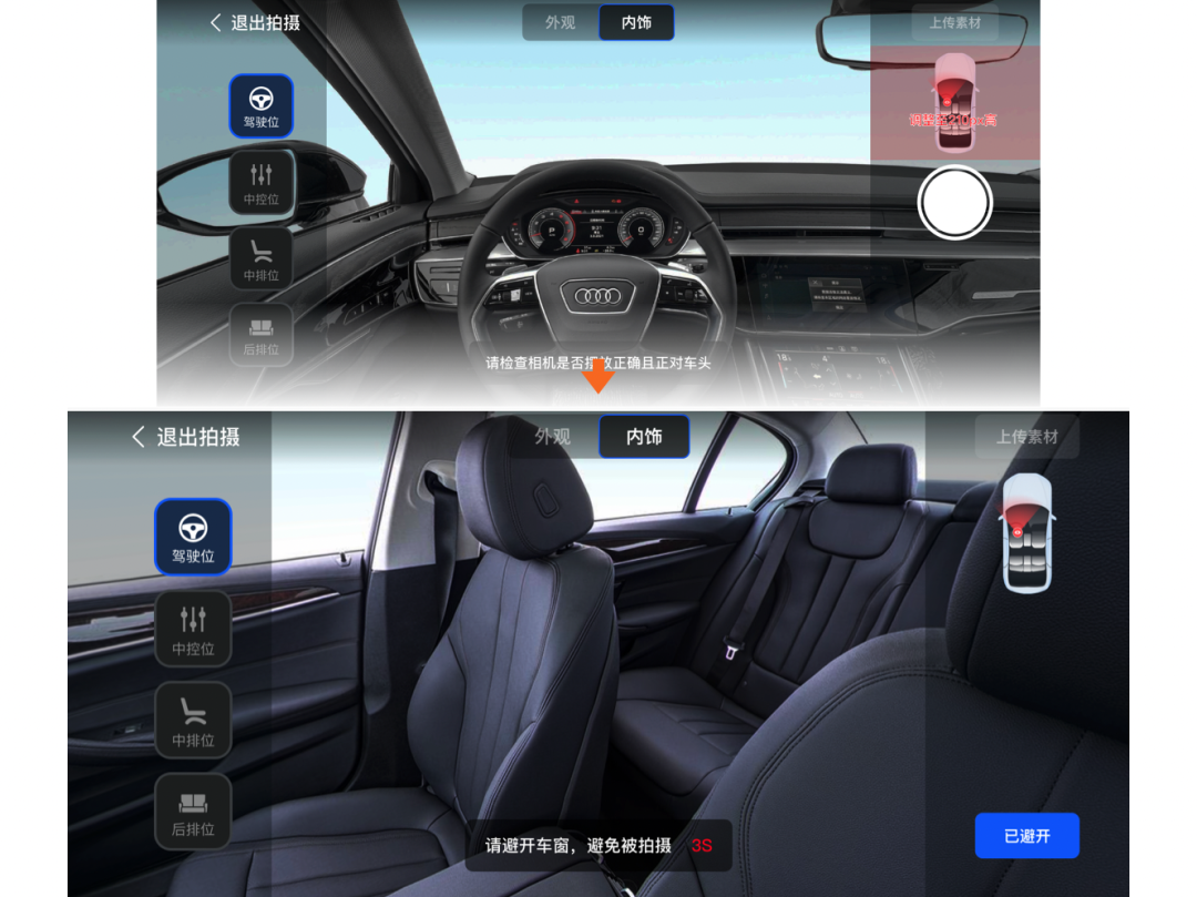 拍摄内饰时,拍摄者常常在关上车门后站在门边就启动拍摄,导致生成的图像中车窗上会出现拍摄者的脸,所以我们需要提醒拍摄者躲避。这种与核心拍摄任务无关的“非必须”行为,拍摄者很难形成记忆点。所以当用户确认开拍内饰时,出现躲避拍摄的过程以数秒提示,以此避免拍摄者的头出现在内饰全景图中的尴尬情况。
