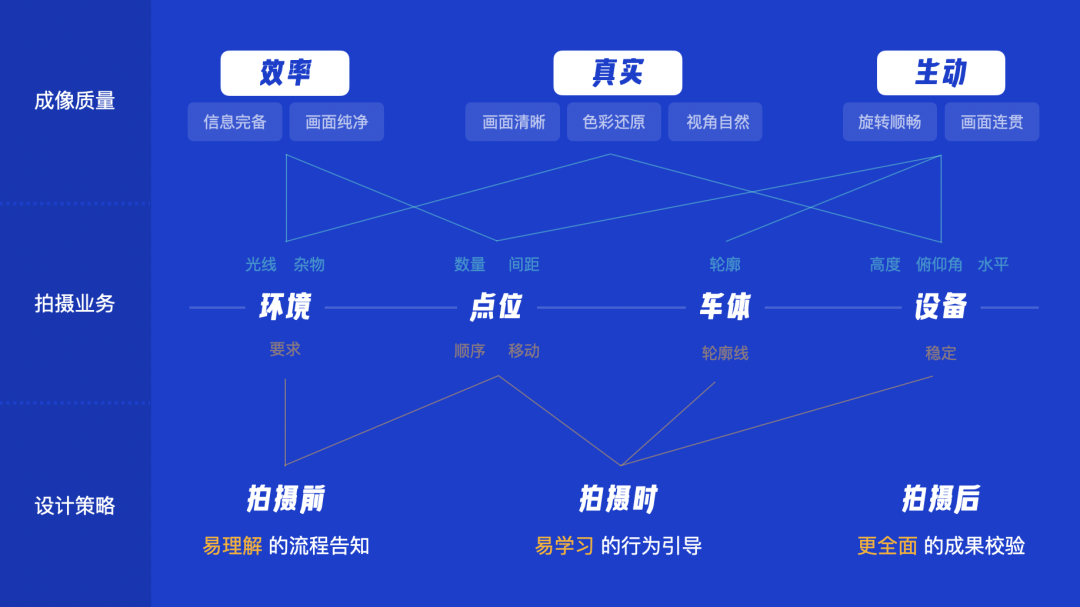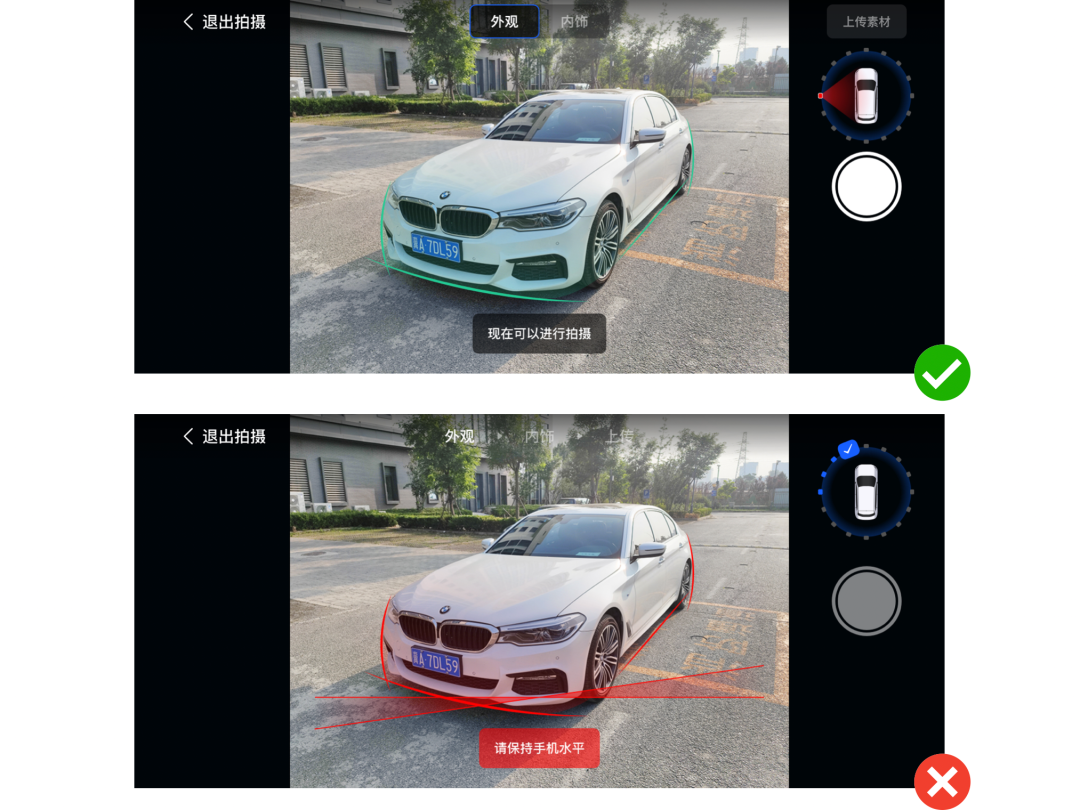 由此我们得知,拍摄者的拍摄行为决定了VR素材质量。所以构建二手车VR体验的第一步,我们确定在通过对VR拍摄工具的设计来规范拍摄者的行为。