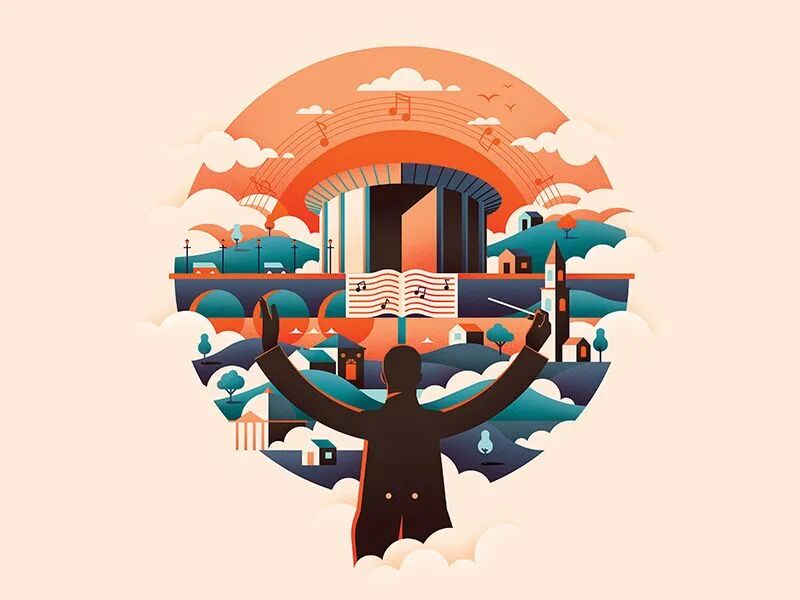 这一点在插画作品中尤为明显,如果采用全屏式构图,那么设计师就得把整个矩形画布都画满素材,但是如果用几何图形构图,那么重点展示主体区域就好,没有足够的空间展示太多辅助的元素和场景,所以可以省去很多创作时间。