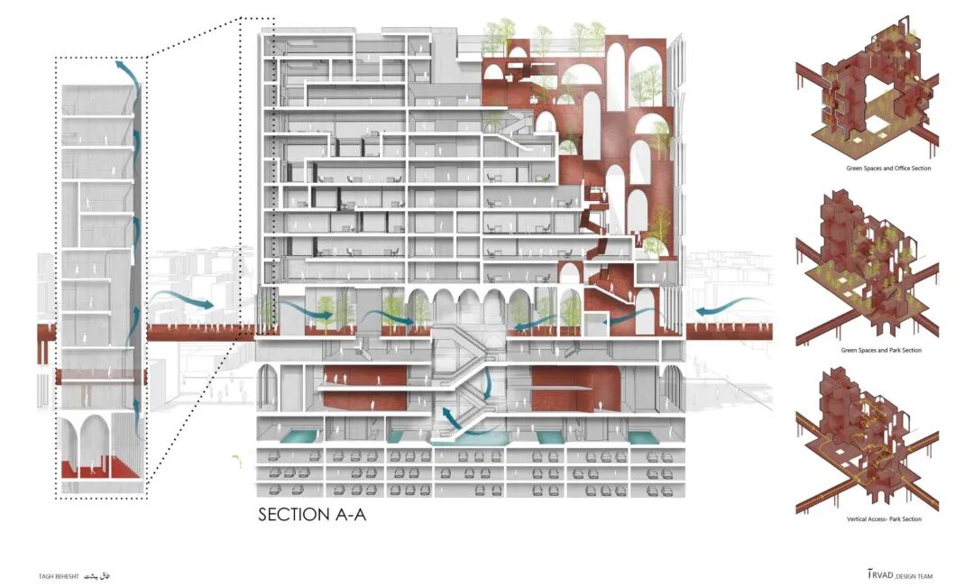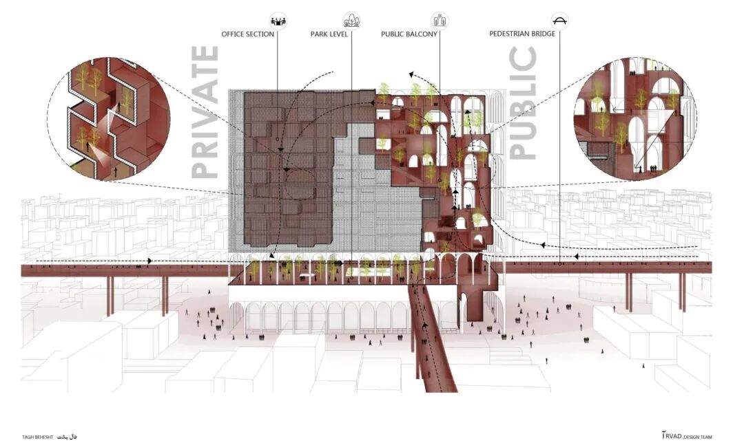 塔格·贝赫什特探索了购物中心如何成为社会和经济重要场所的问题,同时将急需的绿色空间引入密集的城市中心。这一作品赢得了国际赞誉,设计以伊朗集市和马什哈德市的建筑历史为跳板,主要思想之一是使用人行天桥来创造远离城市交通的安全和愉快的人行道。平坦的中间花园就像一个城市交汇处,是所有悬空人行天桥之间的交汇处,也作为项目的中央连接枢纽,更令人兴奋的设计元素之一是办公区之间的悬空庭院。