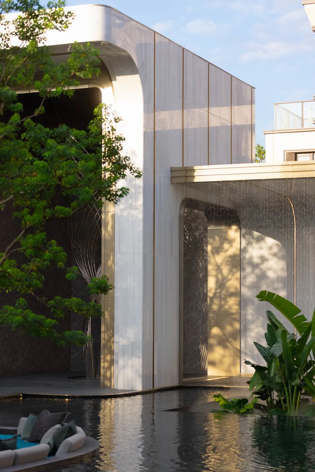 拱顶元素贯穿整个场地,让室内外的空间不断相互呼应着。圆弧形体把空间意向表现得更加柔和,运用细腻的材料与立面肌理划分界面空间,温润中带着典雅的气息。