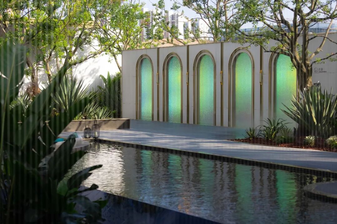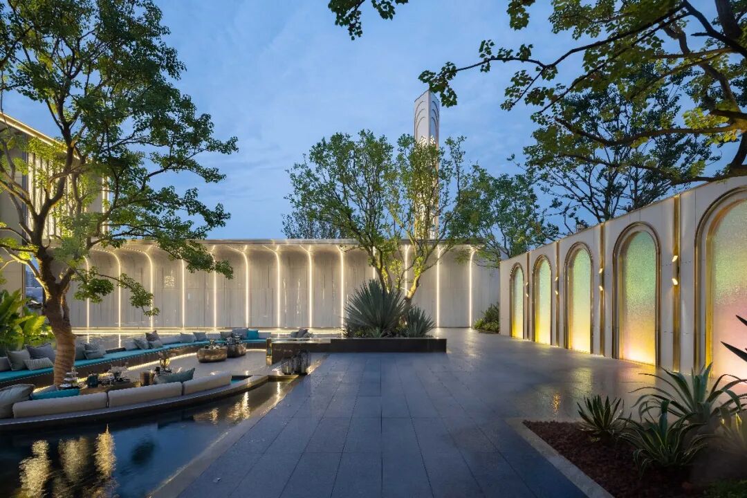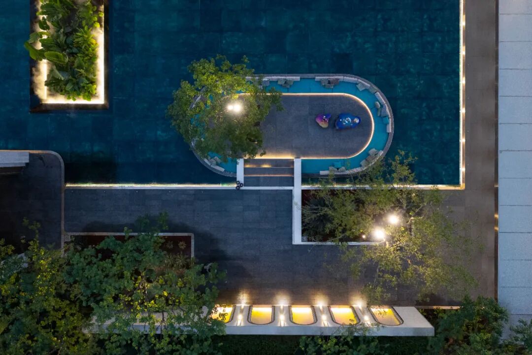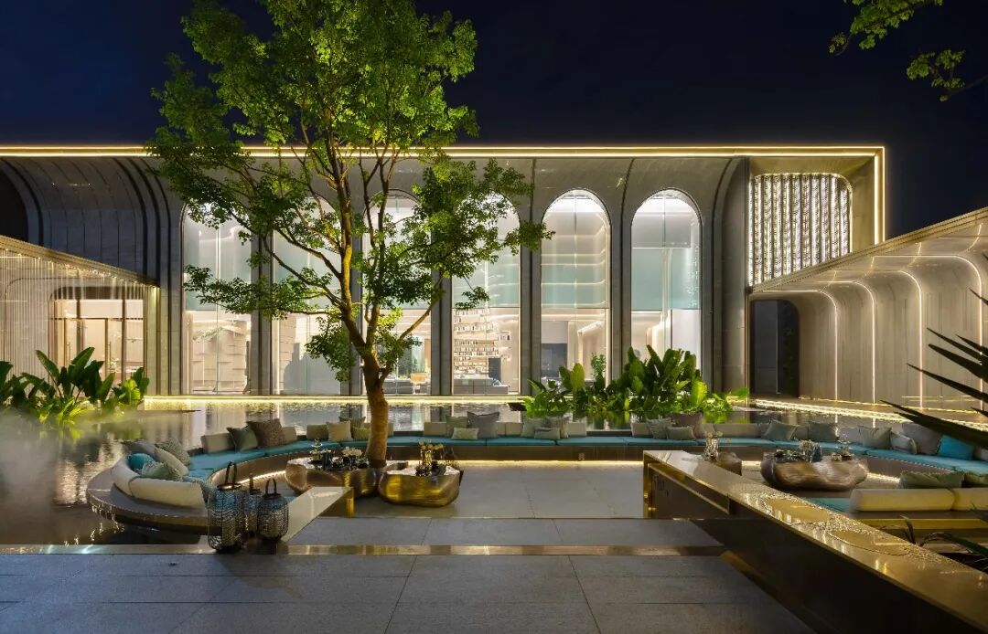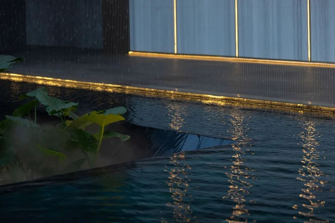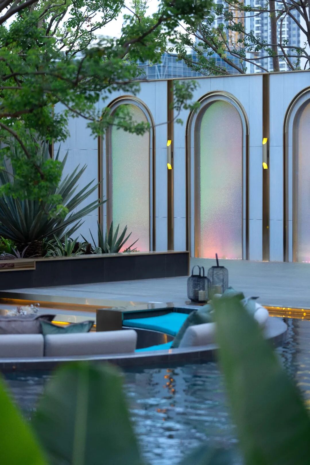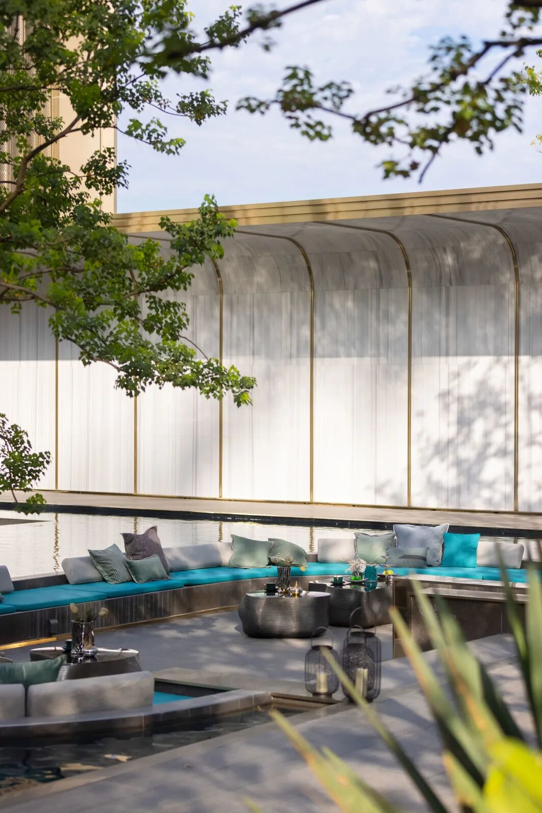 下沉式休息区拥有鲜明的层次关系,一半为可触可感的定制琉璃水面,一半是景观赋予的电影场景般明艳华丽的视觉感受,是酒店级的舒适与奢尚体验。