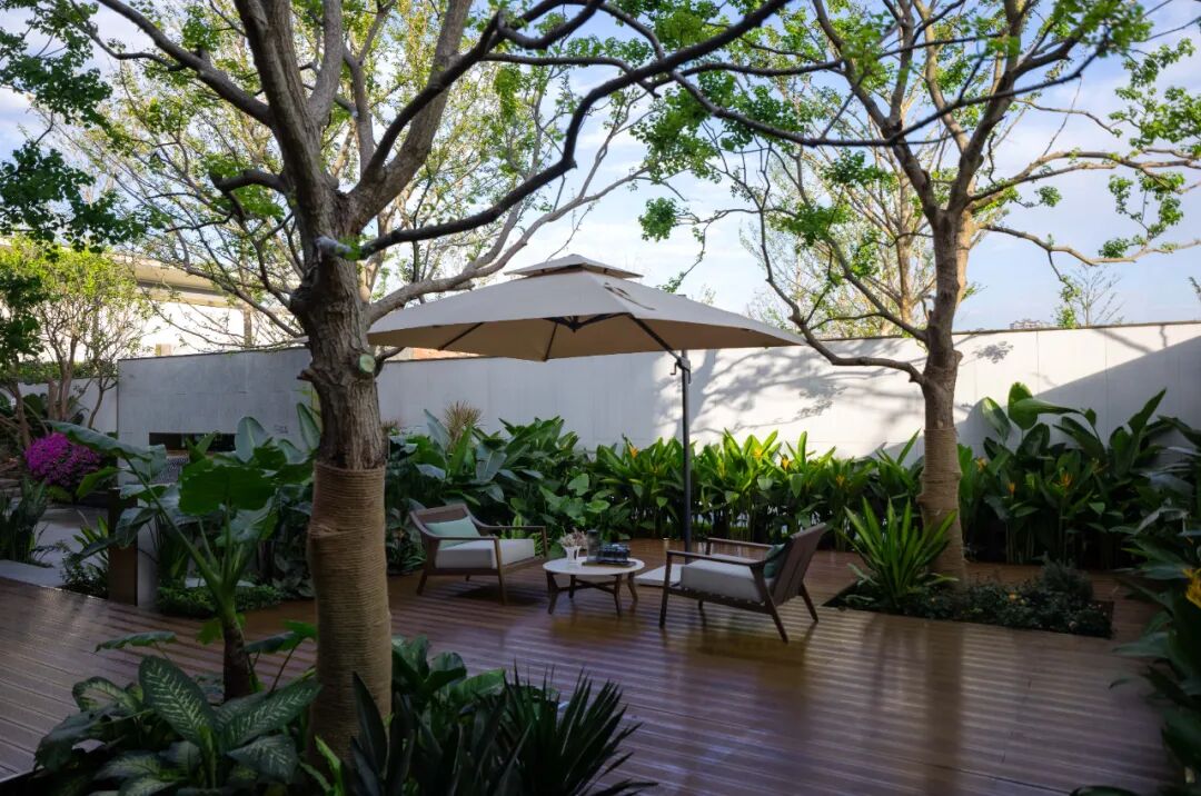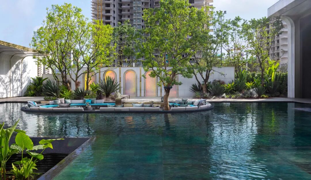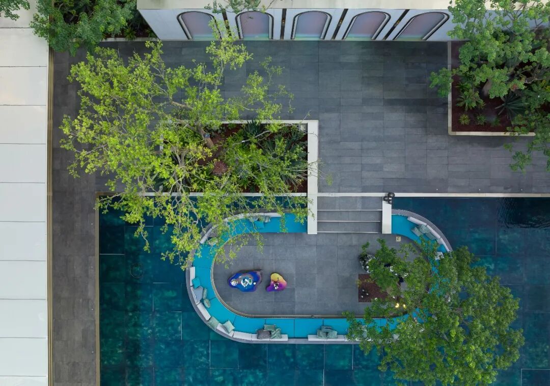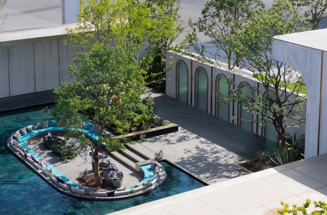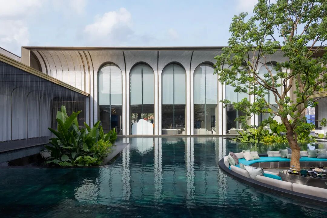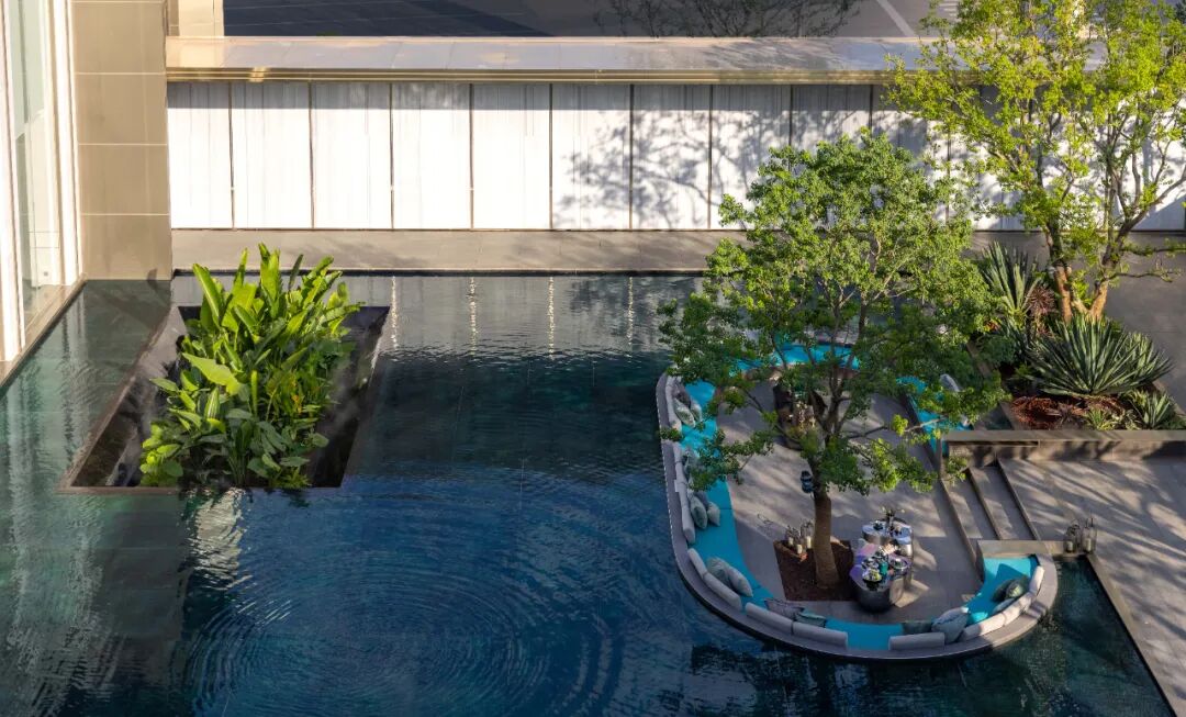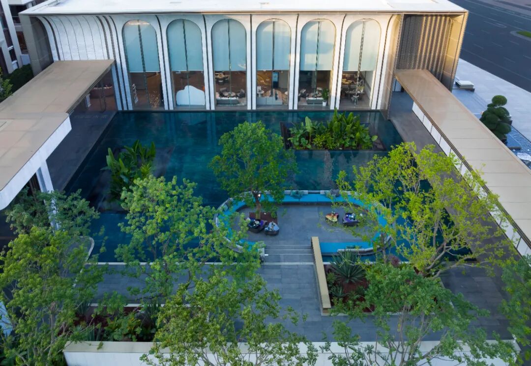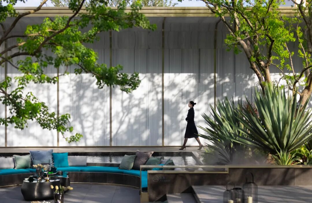 下沉式休息区拥有鲜明的层次关系,一半为可触可感的定制琉璃水面,一半是景观赋予的电影场景般明艳华丽的视觉感受,是酒店级的舒适与奢尚体验。